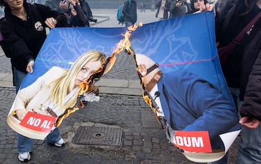 - Durante il corteo sono stati bruciati con i fumogeni due cartelloni raffiguranti la presidente del Consiglio Giorgia Meloni, in uno insieme al ministro della Giustizia Carlo Nordio. Sarebbero stati bruciati anche cartelli con Schlein, "colpevole" di non aver appoggiato la protesta.