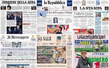 Sulle prime pagine dei quotidiani domina la guerra in Iran: falliti i negoziati Usa-Iran a Islamabad e riesplode la tensione, con Trump che annuncia un blocco navale dello stretto di Hormuz e torna a minacciare di bombardare le centrali elettriche. In primo piano anche la fine dell'era Orban in Ungheria dopo 16 anni al potere: alle elezioni vince l'opposizione guidata da Peter Magyar. Spazio infine allo sport, con Jannik Sinner che conquista il Masters 1000 di Montecarlo e torna in vetta al ranking