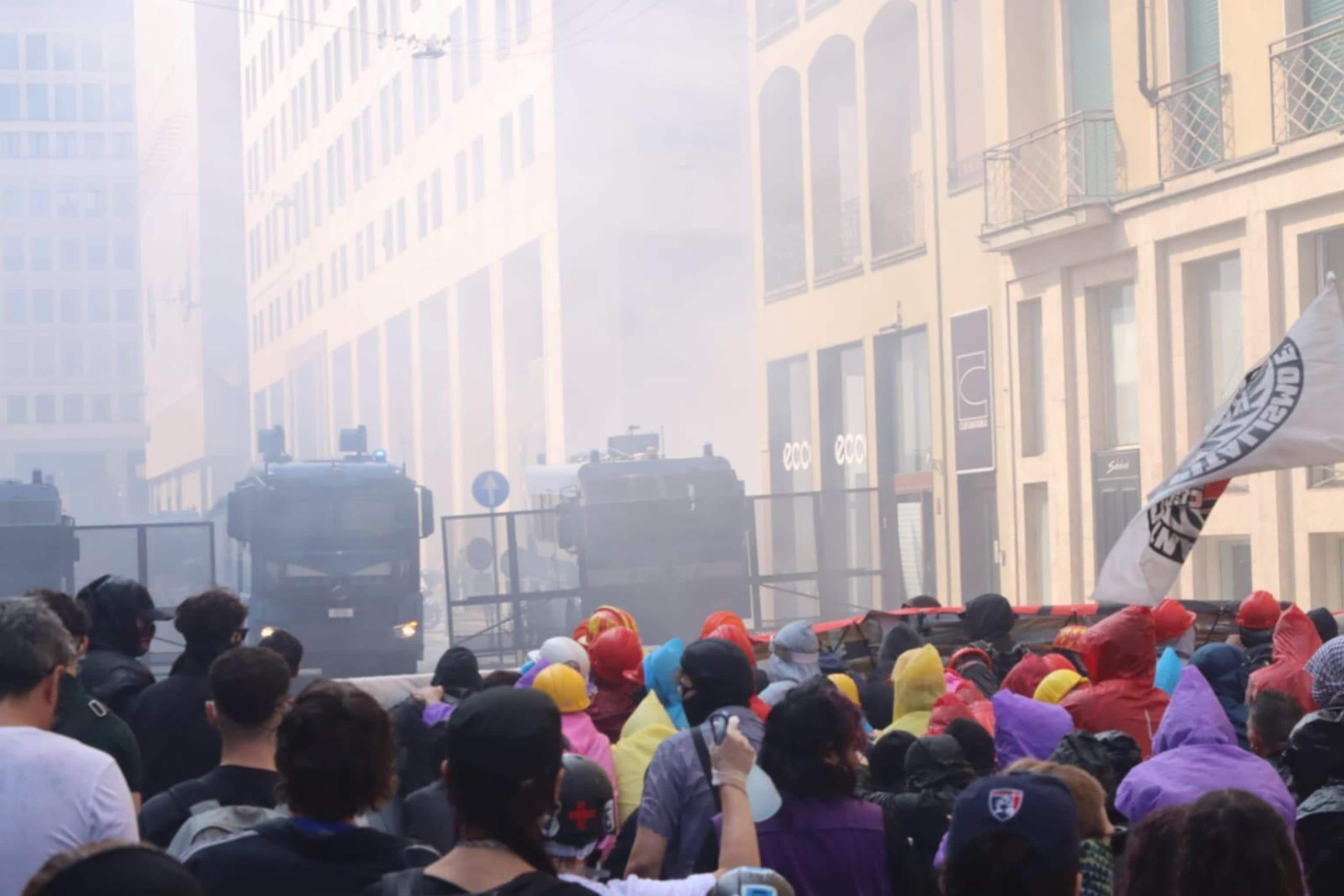 Si sono registrate tensioni tra antagonisti e forze dell'ordine proprio durante uno dei cortei dei centri sociali contro il raduno dei patrioti europei, organizzato dalla Lega, in piazza Duomo. In via Borgogna le forze dell'ordine hanno utilizzato gli idranti contro i manifestanti, mentre gli antagonisti hanno lanciato petardi, fumogeni, bottiglie contro gli agenti, nel tentativo di forzare il blocco e arrivare in piazza Duomo. Dopo le tensioni con le forze dell'ordine in via Borgogna, i manifestanti del corteo antagonista contro il raduno della Lega hanno arretrato, imboccando via Visconti di Modrone e riprendendo il percorso autorizzato. Dal corteo si sono alzati i cori "servi dello Stato" e "fuori i fascisti da Milano".