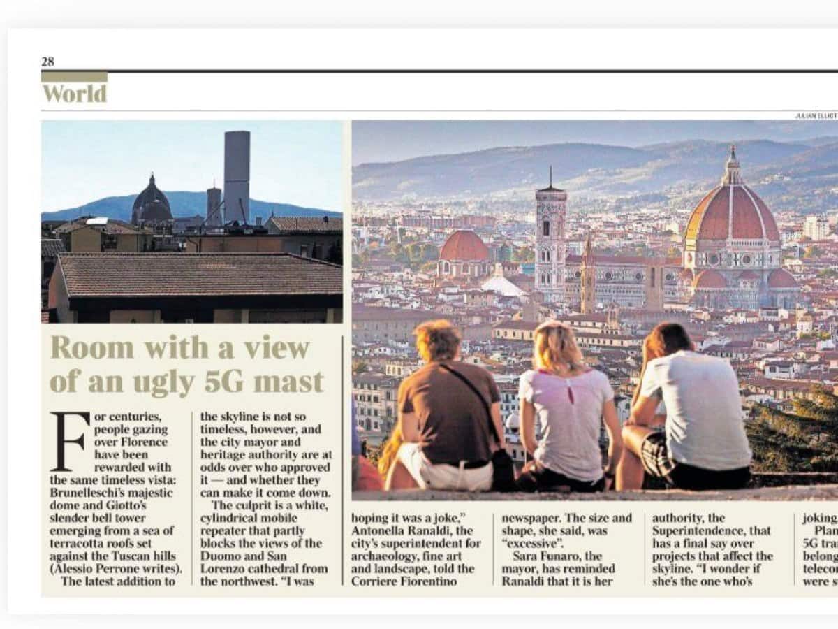 L'antenna 5G è stata montata a gennaio 2023 ed è autorizzata con i pareri favorevoli di Arpat e della commissione Paesaggio del Comune. Ranaldi: “Serve un atto volontario del proprietario per rimuovere la maxi antenna”. Funaro: “Se l’ok non le va bene lo dica”. Per il quotidiano britannico "non è il primo grattacapo urbanistico per la città"
