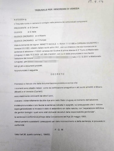 Ed è proprio l’adozione di questo bambino uno dei punti contestati dall’inchiesta de Il Fatto Quotidiano. Secondo il quotidiano, nell’istanza per ottenere la grazia il minore veniva definito abbandonato alla nascita, quando invece risultano due genitori biologici in vita. Nel documento viene riportato anche che il bambino sarebbe figlio adottivo dal 2023 dopo un percorso di affidamento durato tre anni, ma il FQ invece sostiene che Nicole Minetti avrebbe intentato una causa di "separazione definitiva e perdita della patria potestà", vinta nel 2023, per ottenere l'adozione. Nel 2024 il Tribunale per i minorenni di Venezia ha firmato un decreto per il riconoscimento dell'adozione nel nostro Paese, secondo cui "il minore si trovava in stato di abbandono sin dalla nascita, con separazione definitiva dai genitori biologici, i quali sono stati dichiarati decaduti dalla responsabilità genitoriale".