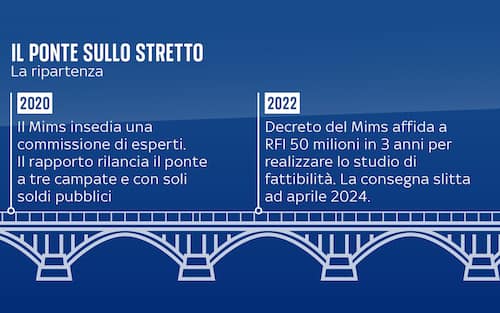 Si torna a parlare del ponte sullo Stretto nel 2020 quando il ministero delle Infrastrutture rilancia il progetto a tre campate, da finanziare con soli fondi pubblici. Con un decreto vengono affidati 50 milioni di euro a Rfi per la realizzazione dello studio di fattibilità