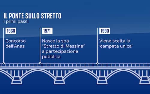 Una storia lunga oltre 50 anni quella del progetto del ponte sullo Stretto di Messina che ha inizio nel 1968 con la legge 384 che conferisce ad Anas, ferrovie dello Stato e Cnr il compito di valutare la fattibilità dell'opera. Nel 1971 il governo autorizza la creazione di una società per la progettazione, la realizzazione e la gestione del ponte sullo Stretto. Dopo il susseguirsi di diversi progetti viene scelto quello a campata unica
