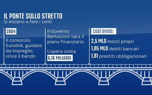 Nel 2004, sotto il governo Berlusconi, il progetto del ponte sullo Stretto sembra essere a un passo dalla sua realizzazione. Viene varato il piano finanziario: 2,5 miliardi sono le risorse a disposizione, 1,85 miliari saranno finanziati attraverso prestiti bancari e 1,81 miliardi attraverso prestiti obbligazionari. Il costo totale per realizzare l'opera è di 6,16 miliari di euro
