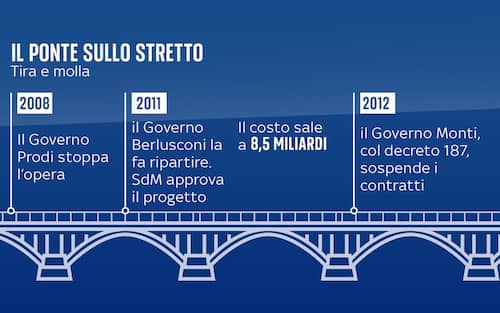 Le fortune del progetto del ponte sullo Stretto sembrano essere legate anche all'avvicendarsi dei diversi governi. Nel 2008 Prodi, che ha sconfitto alle politiche Berlusconi, ferma l'opera che viene fatta però ripartire dallo stesso Berlusconi nel 2011, dopo essere tornato al governo. Solo un anno dopo, con l'arrivo del governo tecnico di Mario Monti, vengono sospesi i contratti
