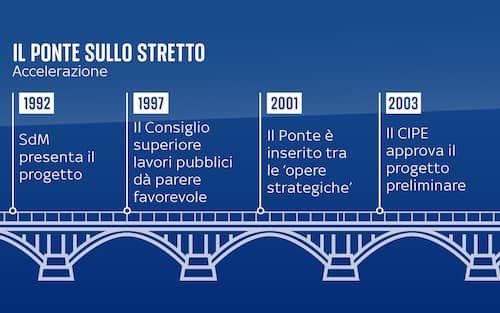 Una storia lunga oltre 50 anni, iniziata nel 1968 con il conferimento ad Anas, Ferrovie dello Stato e Cnr del compito di valutare la fattibilità dell'opera. Il progetto è fermato nel 2008 dal governo Prodi, fatto ripartire da quello Berlusconi nel 2011 e bloccato nel 2012 dal governo tecnico di Monti. A marzo 2025, il governo Meloni approva un decreto che consente l’immediato riavvio del percorso di progettazione e realizzazione. A luglio l'ok del Cda al progetto definitivo, il 6 agosto via libera del Cipess