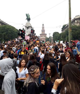 "Milano presente, è in piazza per l'ambiente", è uno degli slogan scanditi in coro nelle piazze e nelle vie di Milano da migliaia di giovani in marcia