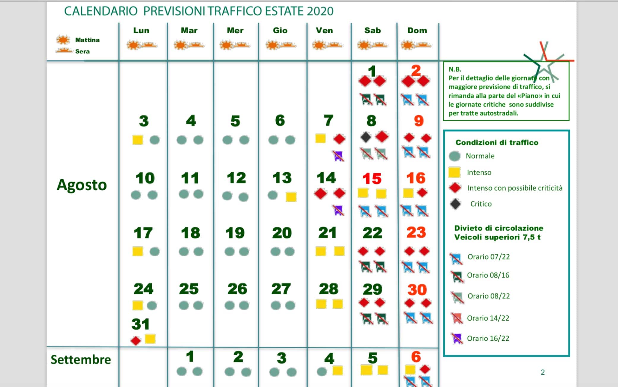 Il Piano divulgato da Viabilità Italia prevede bollino rosso per quasi tutti i weekend del da fine luglio a tutto agosto. Il fine settimana più critico sarà però quello del 7-9 agosto, con bollino nero per la mattina di sabato 8 agosto. Da tenere in conto, pianificando il proprio viaggio, anche alcune criticità particolari presenti nelle tratte in alcune Regioni