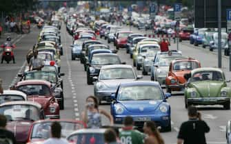 L'attore Michael Keaton, insieme ad altri migliaia di autisti, tenta di battere il record dei tremila Maggiolini su una sola corsia a Berlino in Germania nel luglio 2005 -