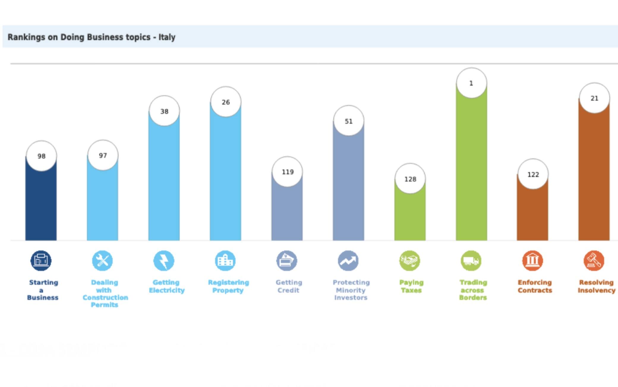 (dati della Commissione parlamentare per la semplificazione nell’ambito di un’indagine conoscitiva sulla semplificazione legislativa e amministrativa, XVII Legislatura)Nella classifica stilata dalla Banca Mondiale per il Rapporto “Doing Business 2020”, che misura la facilità di fare impresa in ogni paese, l’Italia – ottava economia al mondo in termini di Prodotto interno lordo – occupa solo il 58mo posto su 190 Paesi. In alcune specifiche aree nelle quali risultano decisivi il rapporto con le pubbliche amministrazioni o la durata dei processi amministrativi, il nostro Paese si posiziona anche peggio, come si vede da questo grafico di sintesi elaborato dalla Banca mondiale per il caso italiano: