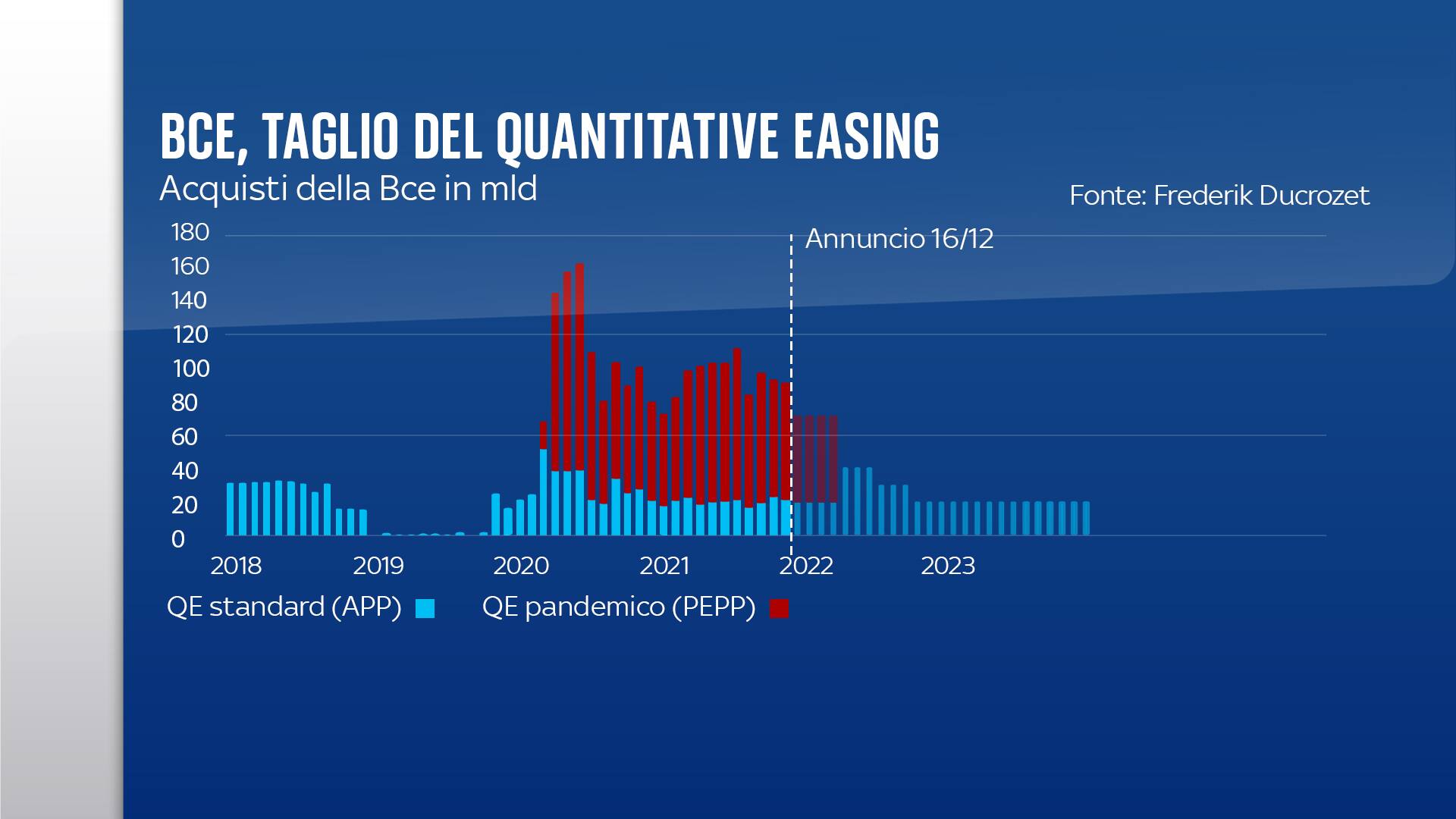 La Banca centrale europea con la riunione di metà dicembre ha invece deciso di essere più cauta: il quantitative easing di ben 1850 miliardi di euro lanciato per la pandemia (Pepp) è destinato a finire a marzo 2022 ma sarà accompagnato da un incremento degli acquisti dei programmi di aiuti che continueranno. L'Asset Purchase Programm (App) verrà infatti arricchito l'anno prossimo prima di 40 miliardi al mese e poi di 30.