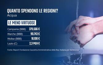 Spesa idrica "fuori controllo" in Regione Lazio. Nel 2020, si legge nel rapporto che analizza le voci di spesa degli Enti locali confrontandole con un benchmark di riferimento, la Regione amministrata da Nicola Zingaretti ha sborsato 2 milioni 335 mila euro in bollette dell'acqua per le sue strutture a fronte della spesa di 1 milione 722 mila euro del 2019, ottenendo il rating 'C', il più basso. Rating basso (BBB) anche per Campania, Molise e Marche