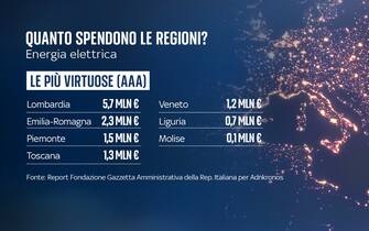 Per quanto riguarda i costi dell'energia elettrica, la Fondazione Gari promuove con una tripla 'A' le seguenti Regioni: Emilia Romagna (2 milioni 362mila euro spesi in bollette per l'energia elettrica); Liguria (769mila euro); Lombardia (5 milioni 731mila euro); Molise (109mila euro); Piemonte (1 milione 520mila euro); Toscana (1 milione 301mila euro); Veneto (1 milione 250mila euro)