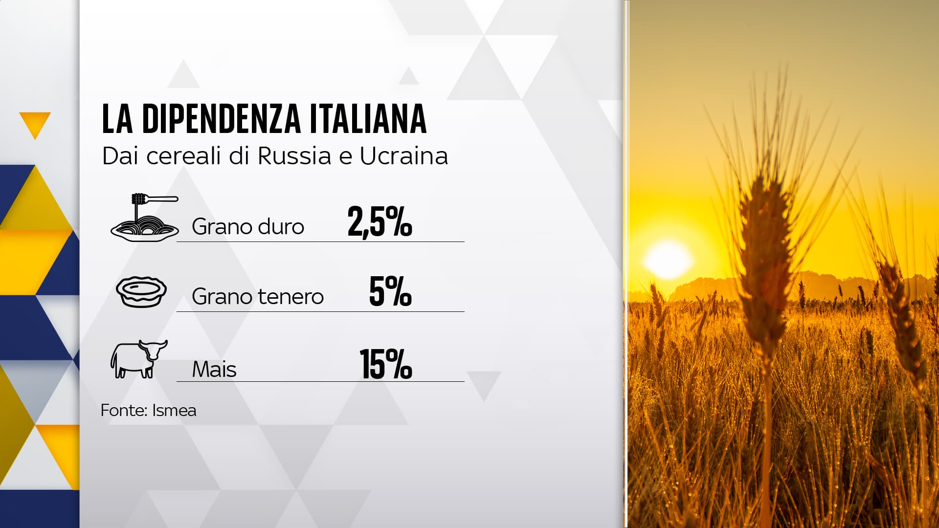 La dipendenza italiana dei cereali di Russia e Ucraina ammonta al 2,5% per il grano duro, al 5% per il grano tenero e al 15% per il mais. Dal grano duro si fa la pasta, dal grano tenero dolci e pane, dal mais foraggio per animali d'allevamento.