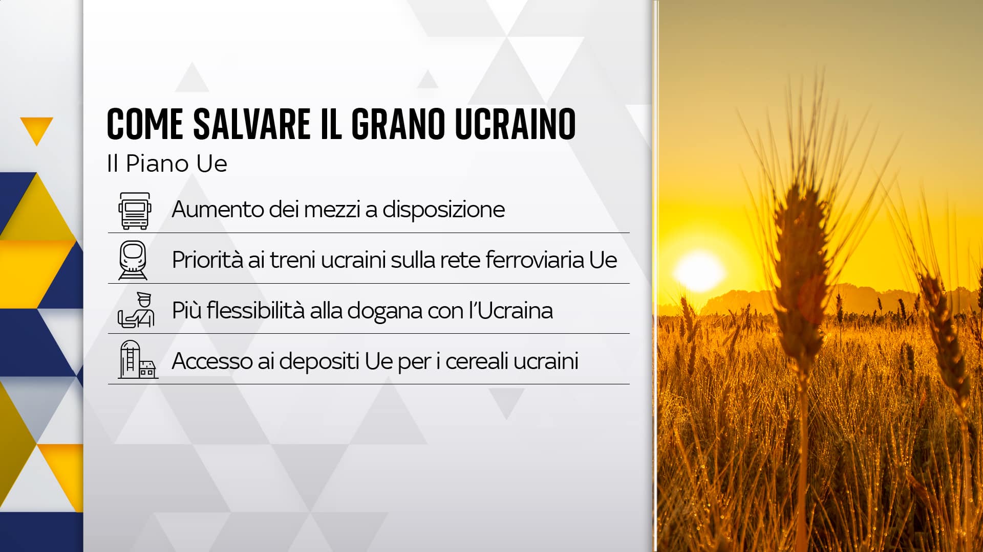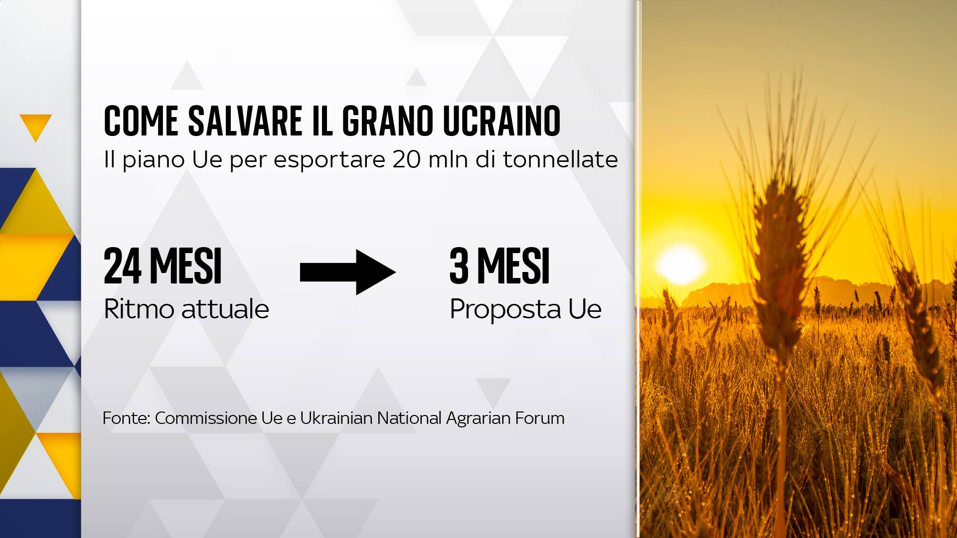 Un piano per salvare il grano ucraino. È quello presentato a Bruxelles dalla Commissione europea per svuotare i silos ucraini pieni di grano e di mais bloccati dal conflitto. Fino all’anno scorso l’Ucraina riusciva a esportare circa 5 milioni di tonnellate al mese di cereali, un numero che ad aprile è crollato ad appena un milione (GUERRA IN UCRAINA. LO SPECIALE - GLI AGGIORNAMENTI IN DIRETTA)