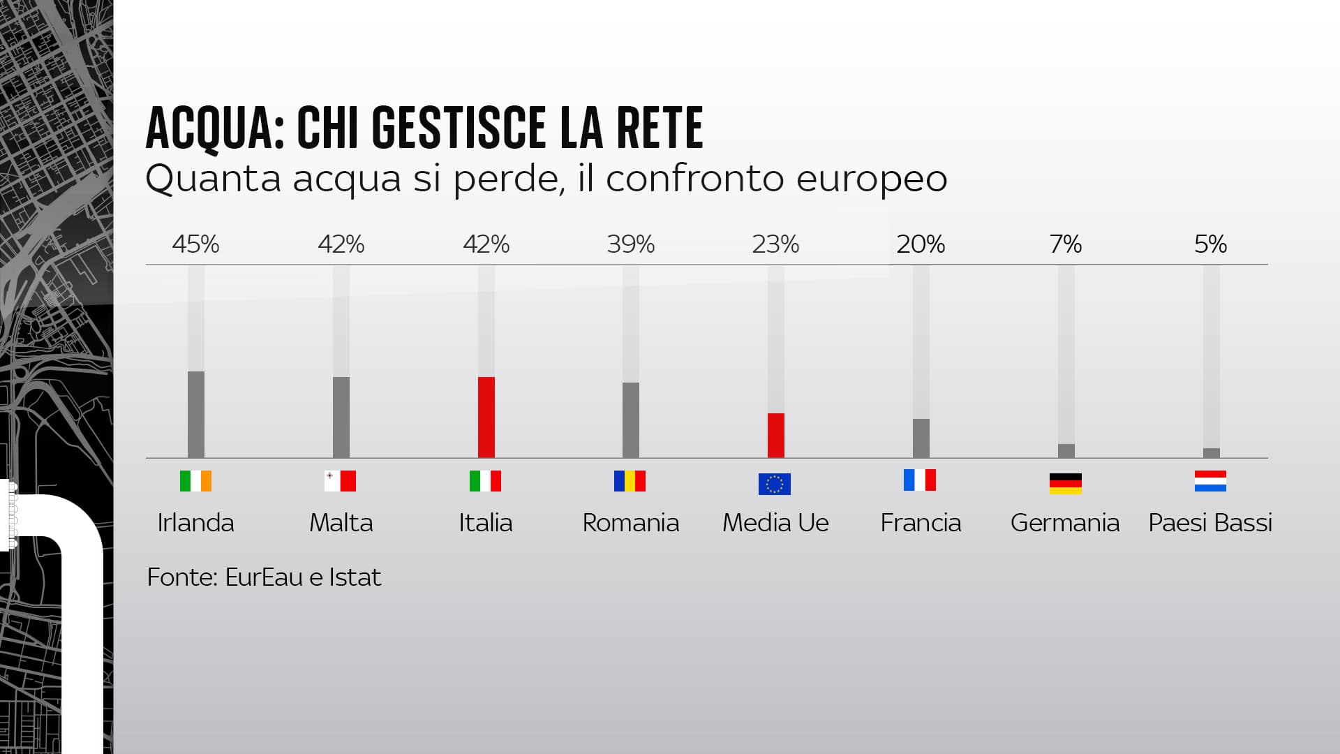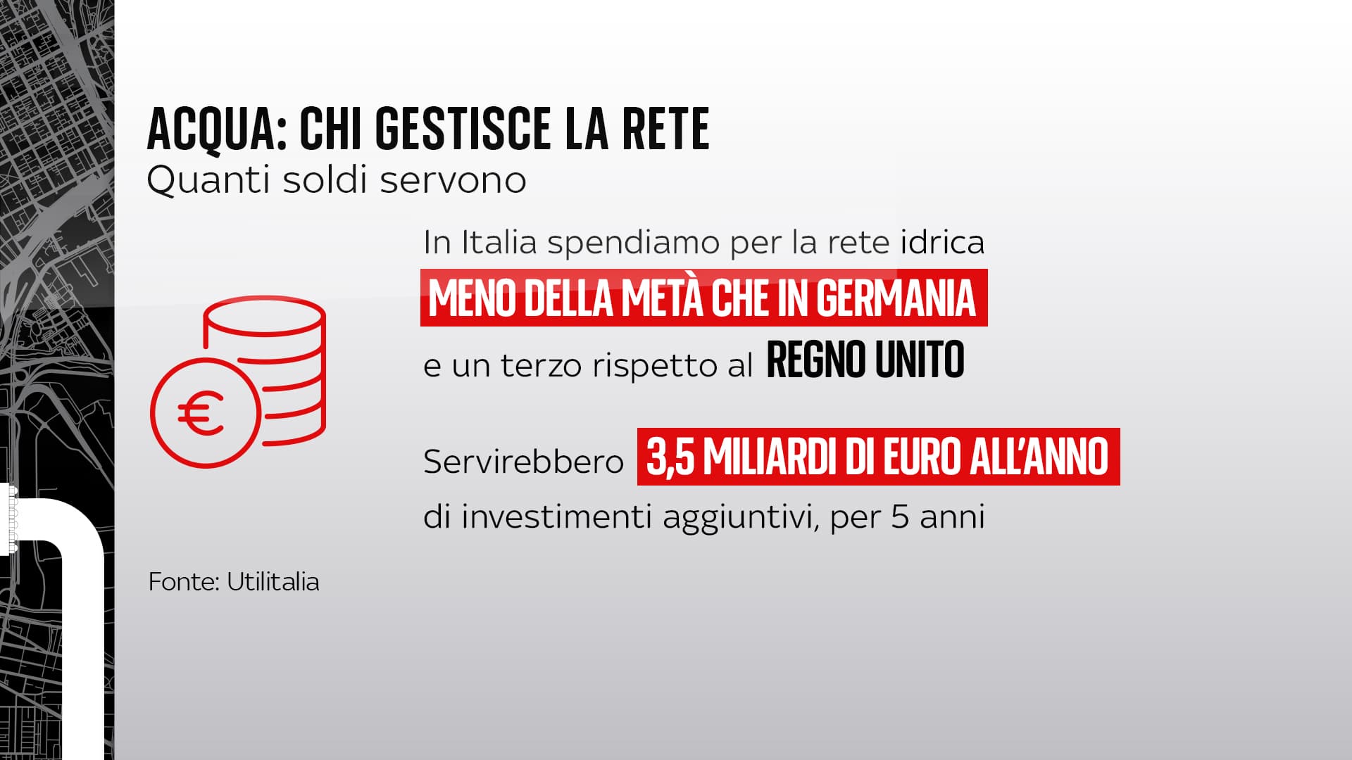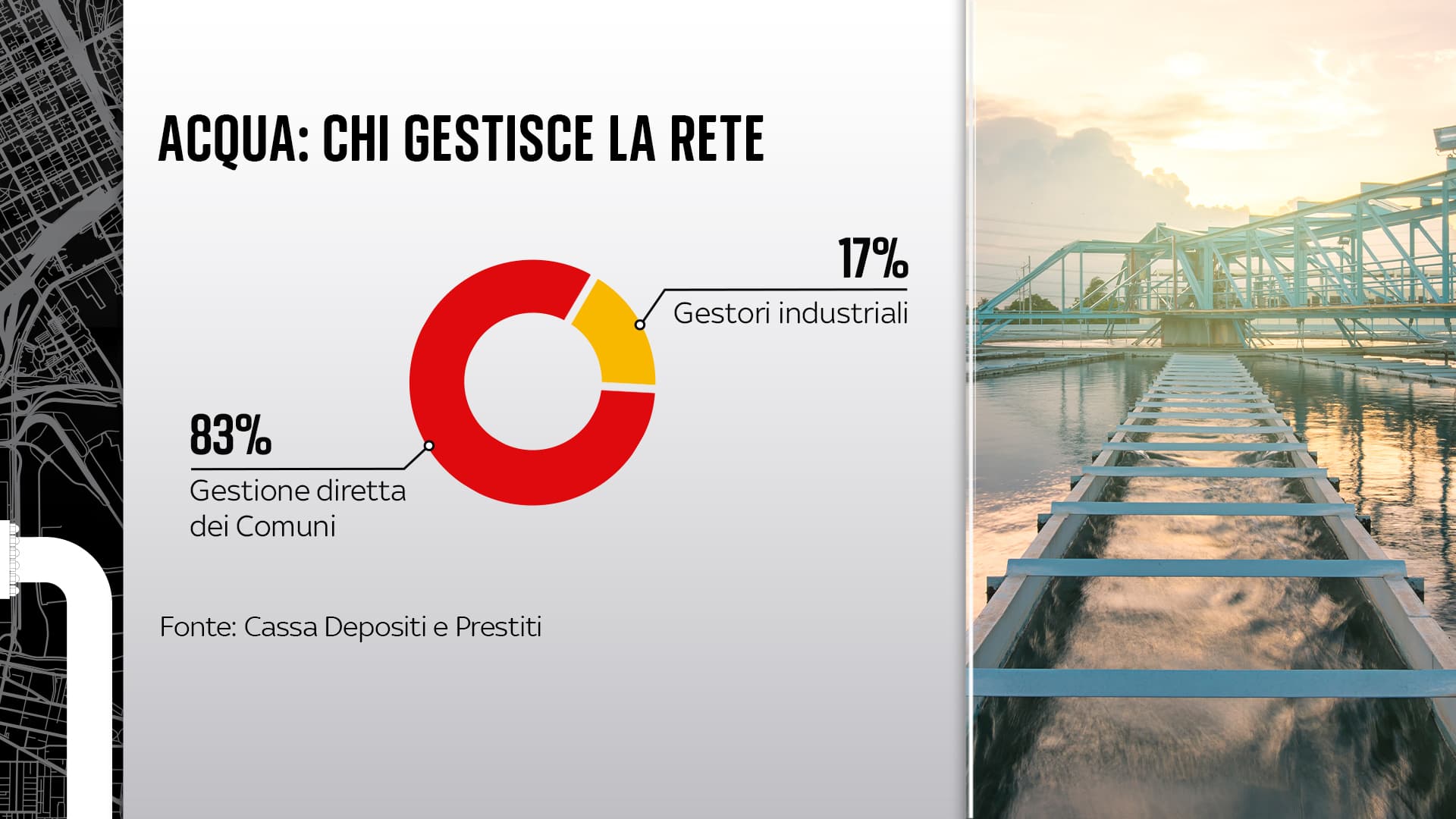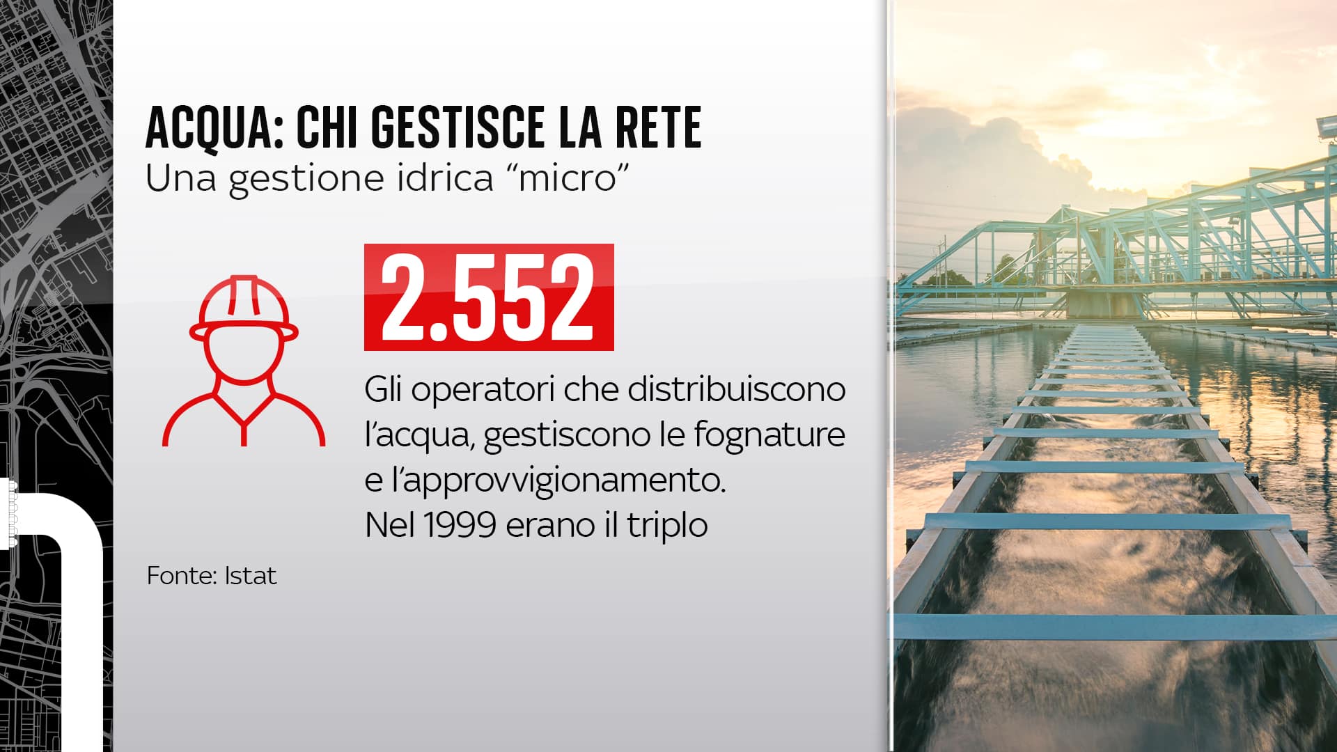 L'Italia è uno dei Paesi europei che spende meno soldi per l'acqua e uno dei motivi è legato ai tanti operatori esistenti. Sono più di 2.500, in molti casi di piccole dimensioni e direttamente controllati dai Comuni. La riforma avviata quasi trent'anni fa è ancora da completare