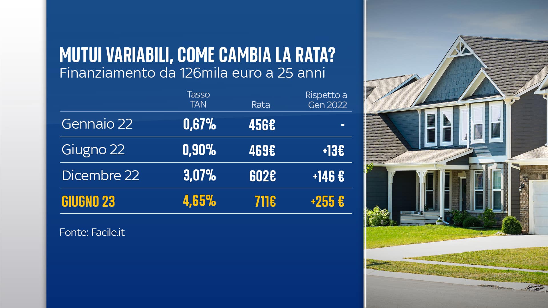 Guardando alle migliori offerte disponibili per lo stesso taglio di prima (126.000 euro in 25 anni) i tassi di interesse partono dal 3,26%, con una rata iniziale di circa 614 euro; dodici mesi fa, invece, si poteva trovare l'1% o poco più, con una rata di circa 477 euro. Questo finanziamento oggi costa quindi 137 euro in più al mese, vale a dire: se si considera l’intera durata del prestito, sono oltre 40.000 euro in più di interessi.