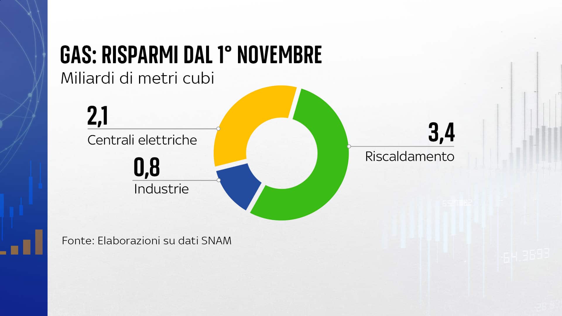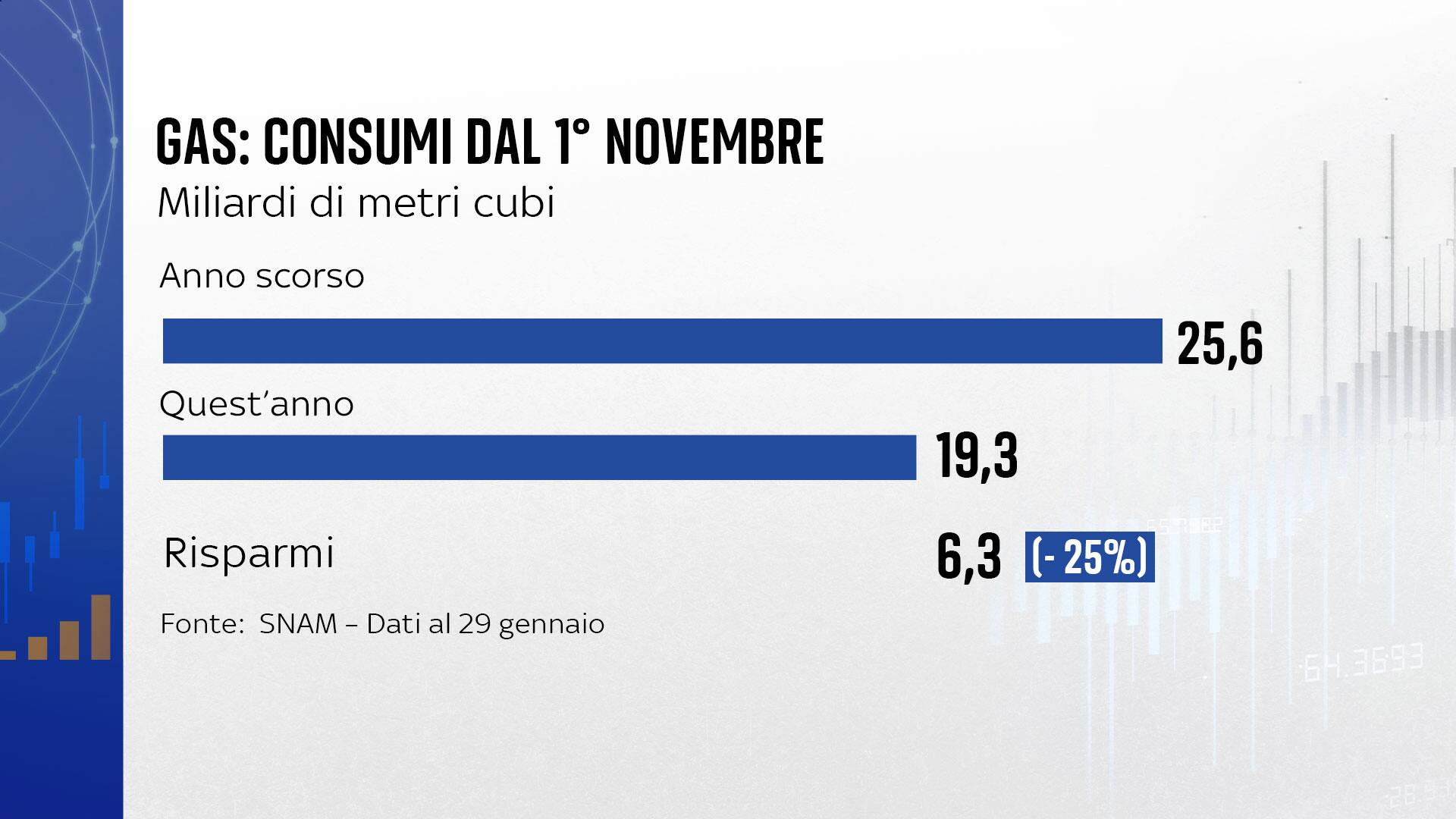 È il forte calo dei consumi di gas la causa principale della discesa delle tariffe in bolletta. L'inverno mite ha ridotto l’accensione dei riscaldamenti, che comunque vanno a un ritmo inferiore rispetto al passato, anche in virtù del piano di risparmi deciso la scorsa estate. Ma non ci sono solo i termostati a uno o due gradi in meno in case e uffici perché anche l’industria, soprattutto quella che utilizza più energia, ha effettuato tagli per contenere i costi e ancora di più le centrali elettriche, che hanno bruciato meno metano.