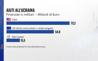 Se si guarda invece sia agli aiuti finanziari sia a quelli militari all'Ucraina, gli Stati Uniti sono al primo posto con oltre 73 miliardi. L'Unione europea ha stanziato poco meno di 55 miliardi di euro