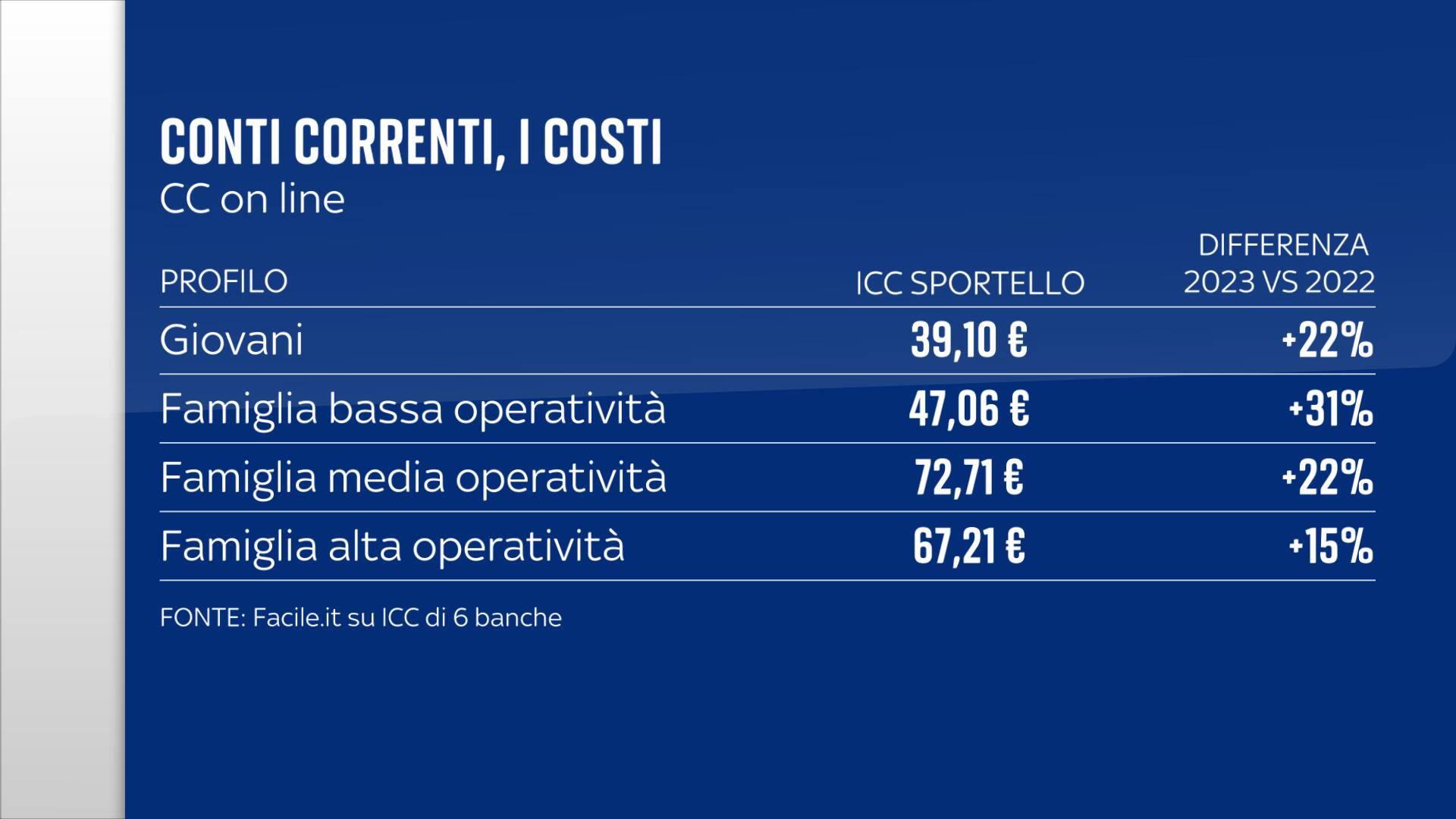 Con i repentini aumenti dei tassi da parte della BCE negli ultimi mesi, sono saliti anche i costi per aprire o mantenere un conto corrente, sia tradizionale che solo on-line: i rincari vanno, in media, dall’8% al 44% nell’ultimo anno. Facile.it ha analizzato gli Indicatori di costi complessivi (ICC) di 6 primarie banche italiane, confrontandoli con quelli del 2022: in un anno, i prezzi sono saliti e per mantenere un nuovo conto corrente si spende, in media, fra i 32 e i 160 euro annui.