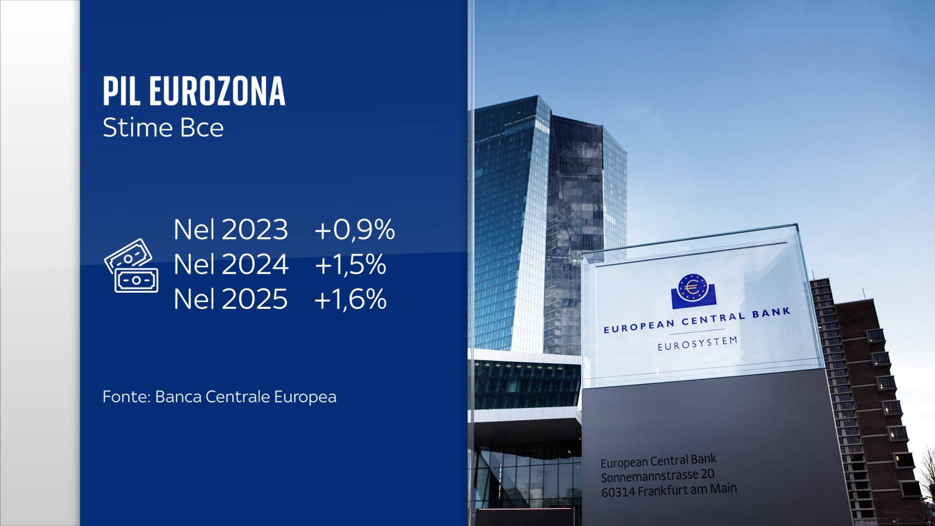 Da qui il nuovo inasprimento sui tassi che, tra i suoi effetti, ha quello di rendere più costosi prestiti e mutui per famiglie e imprese. D’altra parte, il quadro resta incerto. Lo conferma la recessione in cui è entrata la Germania, la locomotiva d’Europa. L’Italia viaggia meglio, ma la Bce intanto abbassa le stime sul Prodotto Interno Lordo dell’Eurozona, visto ora crescere sotto l’uno per cento nell’anno in corso.
