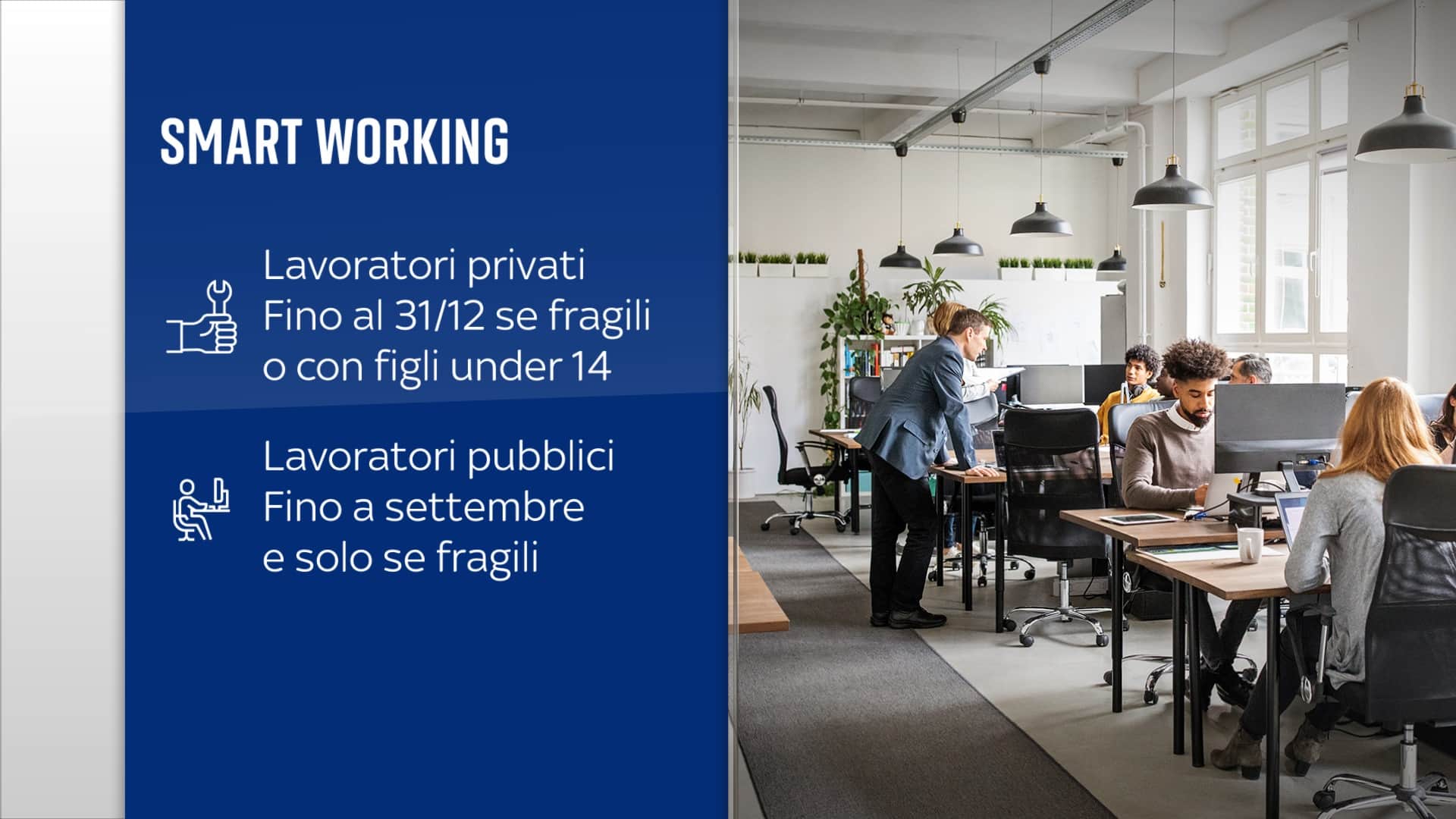 Prorogata fino a dicembre nel settore privato la possibilità dello smart working per chi è fragile o ha bambini fino a 14 anni; nel pubblico vale fino a settembre e solo per chi ha problemi di salute. Se non si fosse fatto nulla il lavoro agile, nella formula semplificata inaugurato durante la pandemia, sarebbe finito il 30 giugno.