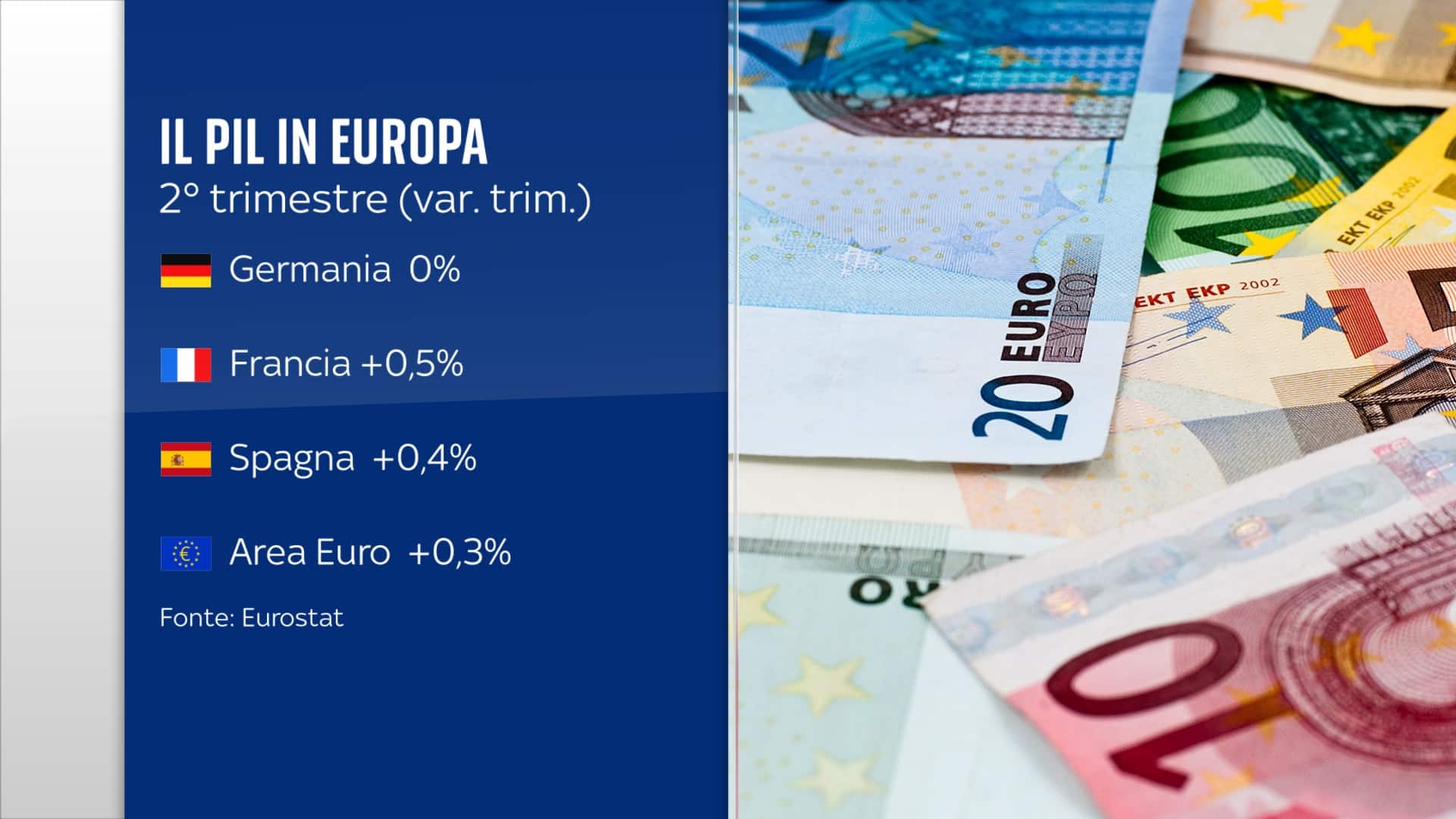 A pesare sulla nostra economia diversi fattori, fra i quali la recessione in Germania, Paese dove molte nostre aziende manifatturiere esportano i loro prodotti e stanno, dunque, risentendo del cattivo andamento della locomotiva d’Europa. Che però nel secondo trimestre ha vista una variazione nulla del suo Pil, mentre Francia (+0,5%) e Spagna (+0,4%) hanno avuto un rialzo, così come – in media – l’intera Eurozona (+0,3%).