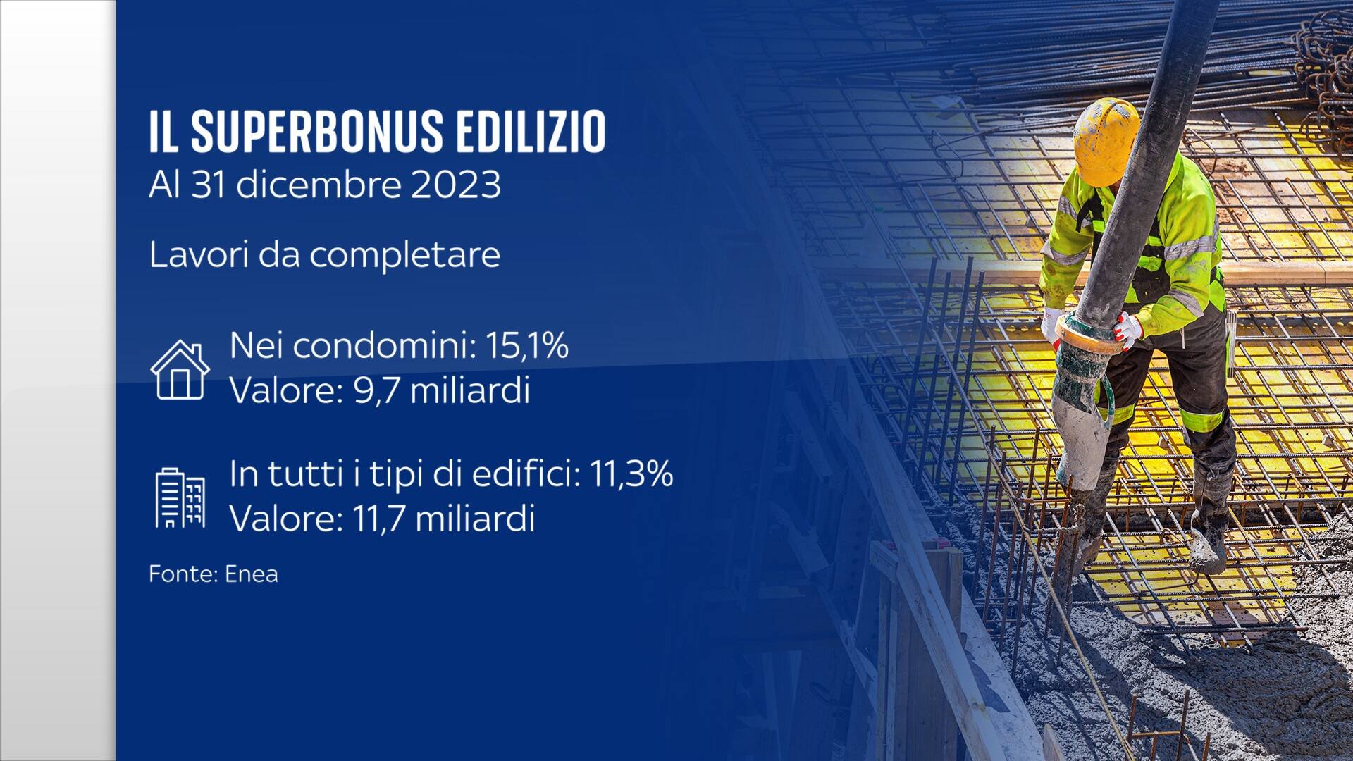 Il rapporto dell'Enea ci dice anche che ci sono ancora molti lavori da completare. In totale si tratta di chiudere più dell’11 per cento dei cantieri, una percentuale che sale al 15 per i condomini. Per questi edifici ci sono quasi 10 miliardi di opere da portare a termine e la strada per arrivare al traguardo è in salita.