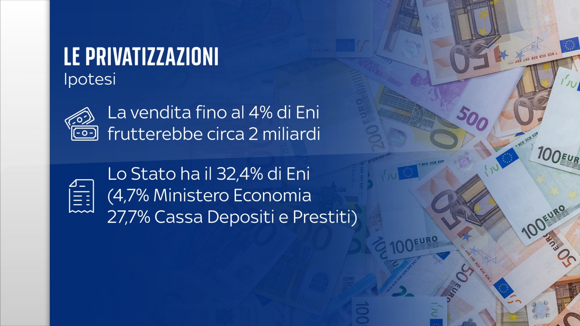 EconomiaIl governo vuole incassare 20 miliardi entro tre anni mettendo sul mercato quote di società controllate. Molte le ipotesi sul tavolo, da ultimo la cessione fino al 4 per cento del gigante dell'energia Eni. Nessuna conferma o smentita. Sul tavolo, poi, ci sarebbe la vendita di pezzi di Poste Italiane e Ferrovie, che comunque rimarrebbero sotto il cappello dello Stato