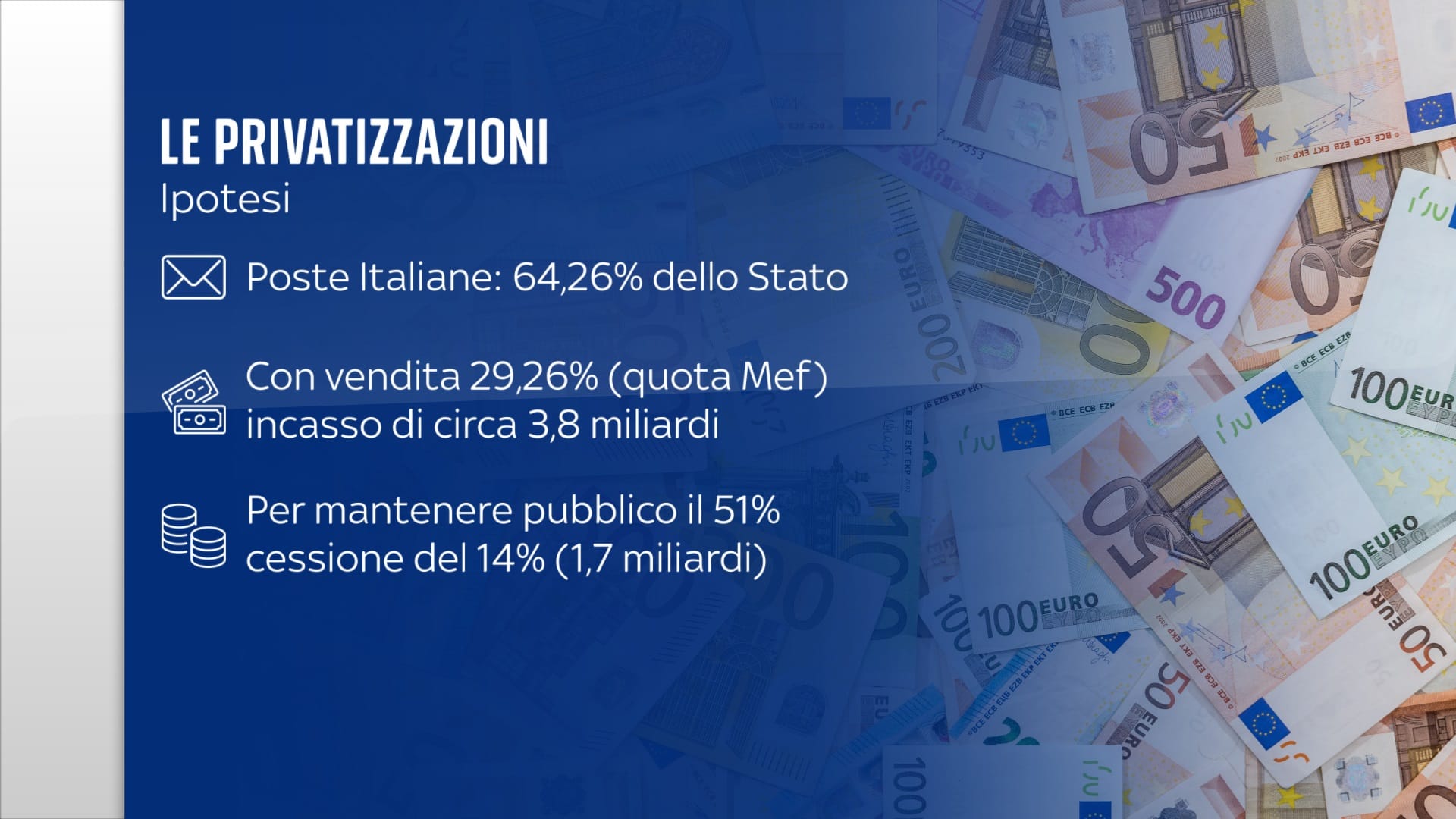 Per raggiungere l’obiettivo delle privatizzazioni, ovviamente Eni non basta. Sul tavolo ci sarebbe anche Poste Italiane, al 64 per cento dello Stato. Quanto si lascerebbe ai privati è da decidere: dimezzare la quota pubblica frutterebbe quasi quattro miliardi, conservarne il 51 per cento porterebbe molto meno (1,7 miliardi). In ogni caso, i tempi sarebbero molto più lunghi di quelli di Monte dei Paschi di Siena, di cui a novembre è stato ceduto il 25 per cento (per 920 milioni) con un iter rapido che non garantisce il massimo introito.