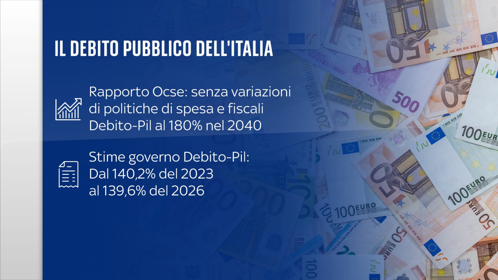 Il peso del nostro debito pubblico rischia di aumentare. La previsione dell’Ocse pungola Palazzo Chigi: bisogna varare politiche per un duraturo aggiustamento di bilancio – si legge nell’ultimo rapporto sull’Italia - perché la crescita sta rallentando e c'è il rischio che il debito possa salire fino al 180 per cento del Pil nel 2040.