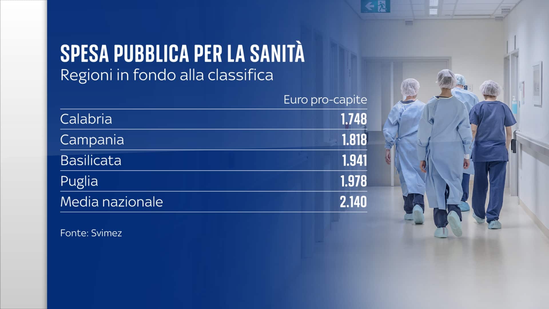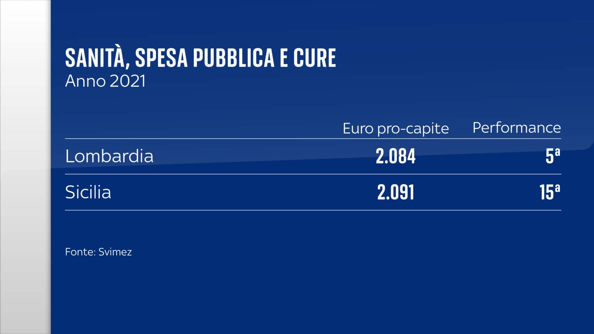 Quanti soldi pubblici si spendono per la sanità in Lombardia? E quanti in Sicilia? La cifra è quasi identica: poco più di duemila euro l’anno per abitante. Ma nella classifica della qualità delle cure c’è un abisso: Lombardia quinta, Sicilia quindicesima. Un divario che pesa sulla pelle di chi sta male e così molti al Sud fanno la valigia per un intervento o un controllo.