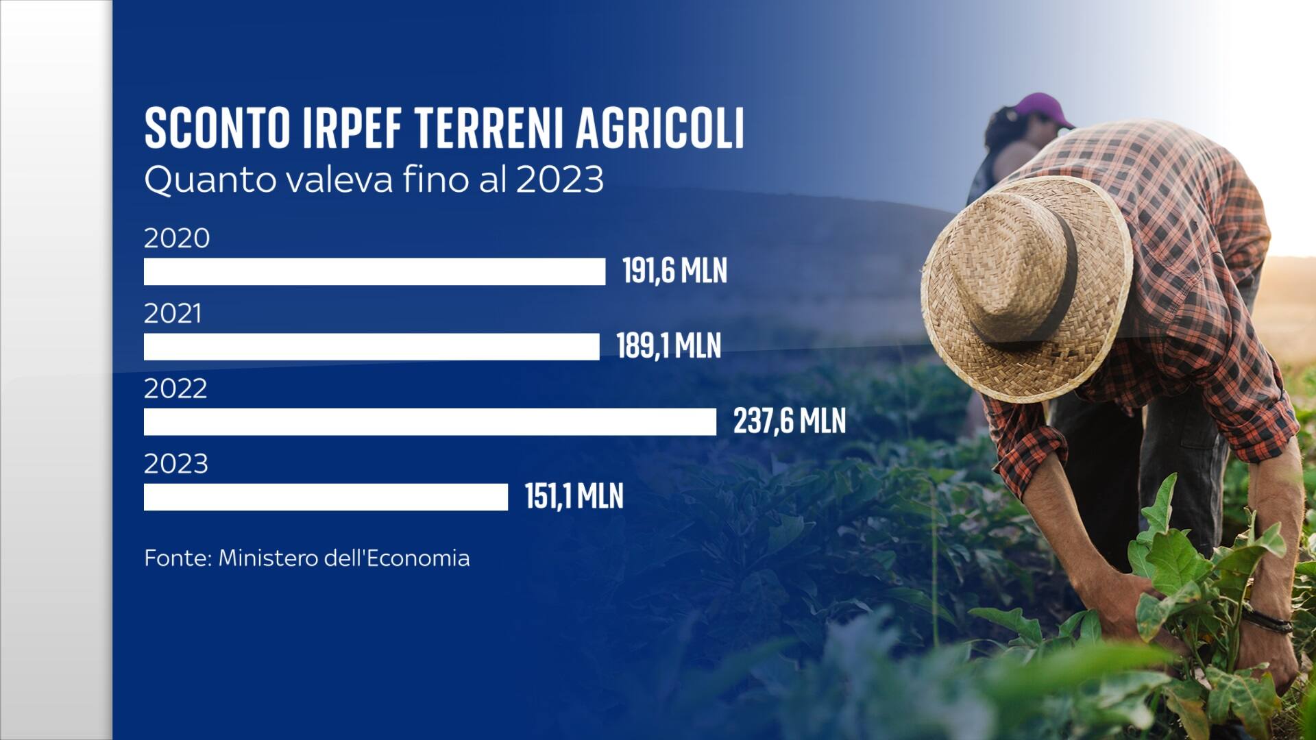 Per sette anni, questa tassa è stata congelata, ma, con l’ultima manovra, il governo non ha prorogato lo sgravio. A beneficiarne sono stati circa 400mila contribuenti, fra coltivatori diretti e imprendori agricoli che versano i contributi previdenziali, con un buco per le casse dello Stato stimato in circa 200 milioni di euro l'anno.
