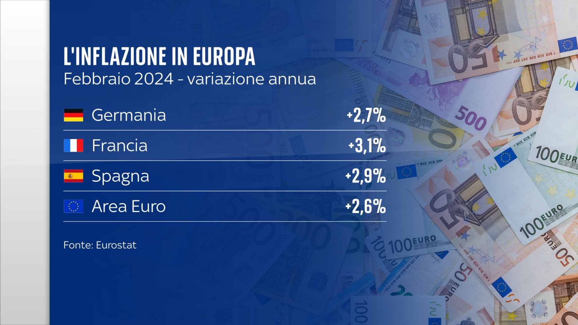 Una situazione che riguarda anche il resto d’Europa, dove l’inflazione rimane più alta rispetto alla nostra. Nella media nell’Eurozona è scesa al 2,6 per cento, un livello che dà qualche movente in più a chi spinge la Banca Centrale Europea a tagliare i tassi d’interesse.