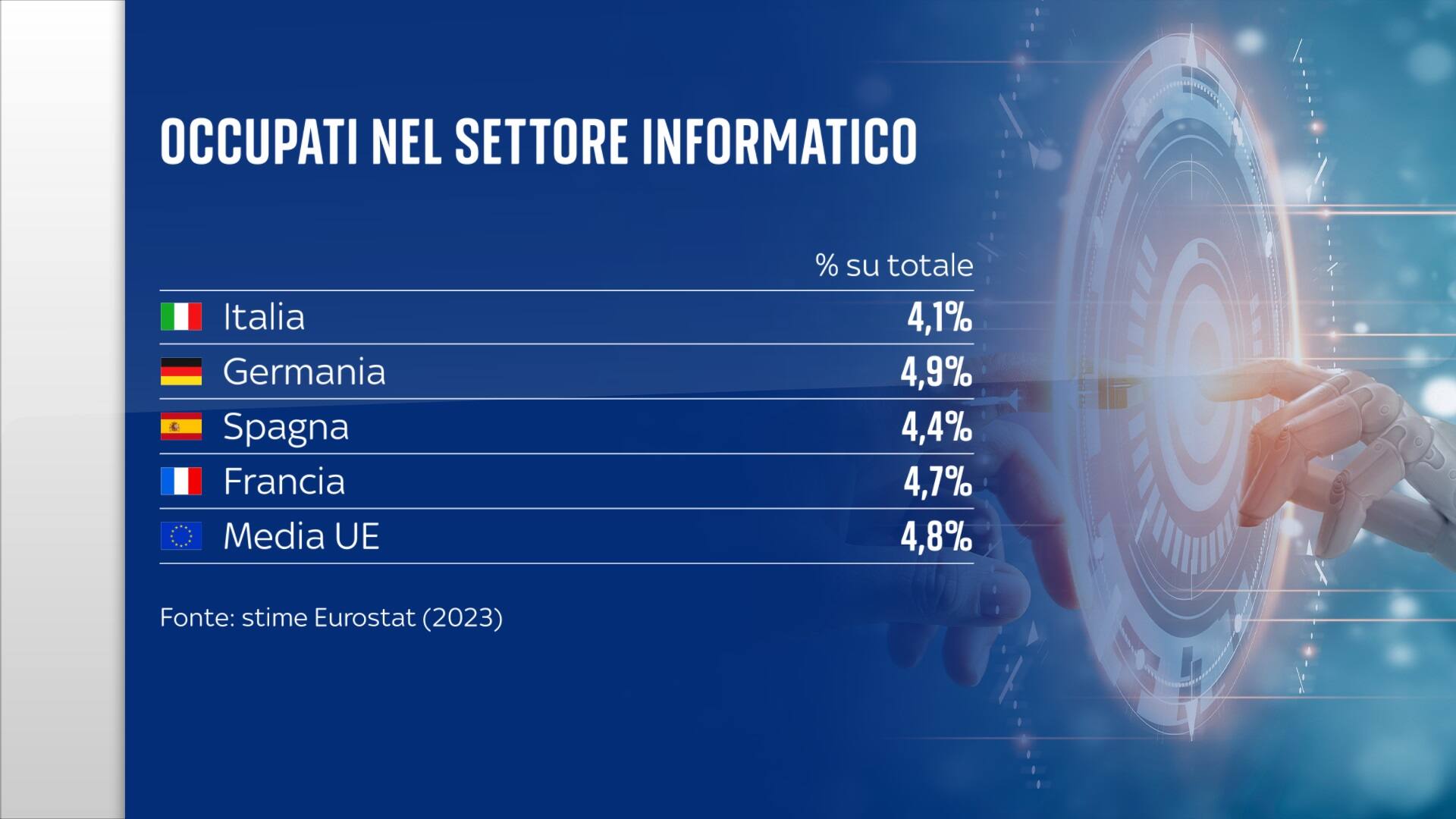 In pratica, ci sono pochi professionisti per far funzionare computer, reti di telecomunicazione, trasmissione di dati e rendere, così, operativa l’intelligenza artificiale. Solo il 4 per cento di tutti gli occupati in Italia è impiegato come informatico, relegandoci tra gli ultimi posti dell’Unione. Dove, comunque, si arranca.