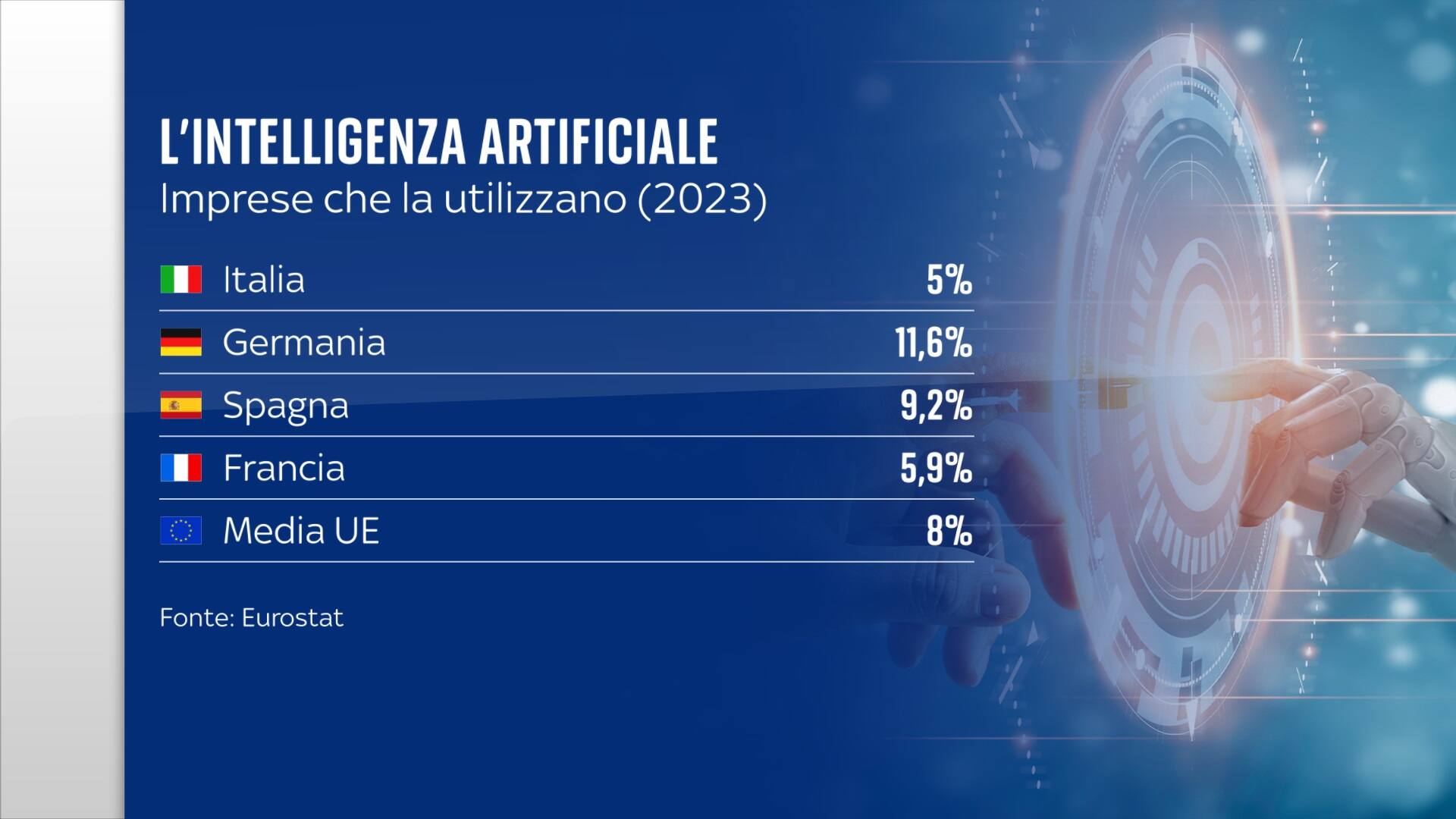 L’Italia, invece, è in ritardo. Solo il 5 per cento delle nostre imprese nel 2023 ha utilizzato l’intelligenza artificiale: lontanissimi dalla Germania, dietro Spagna e Francia e al di sotto della media Europea. Abbiamo persino fatto un passo indietro rispetto al 2021.
