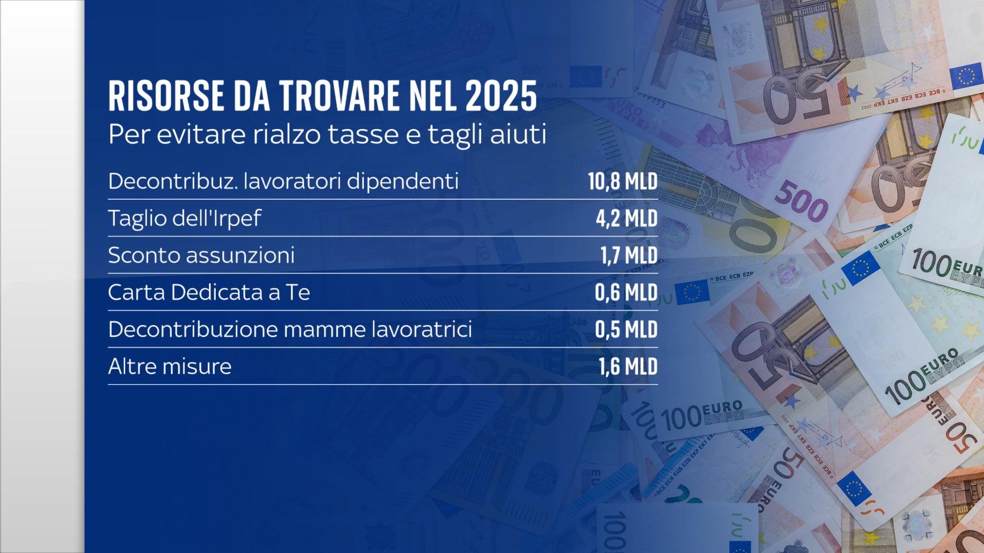 Tra gli aiuti in scadenza c’è la riduzione dell’Irpef (l’imposta sui redditi), che interessa 25 milioni di contribuenti, con benefici che variano da pochi euro fino a 260 euro l’anno per chi ha guadagni alti. A rischio anche gli sconti per incentivare le assunzioni e quello per le mamme lavoratrici con due figli, ma anche la Carta dedicata a Te (500 euro per la spesa alle famiglie più in difficoltà) e la riduzione da 90 a 70 euro del canone Rai.