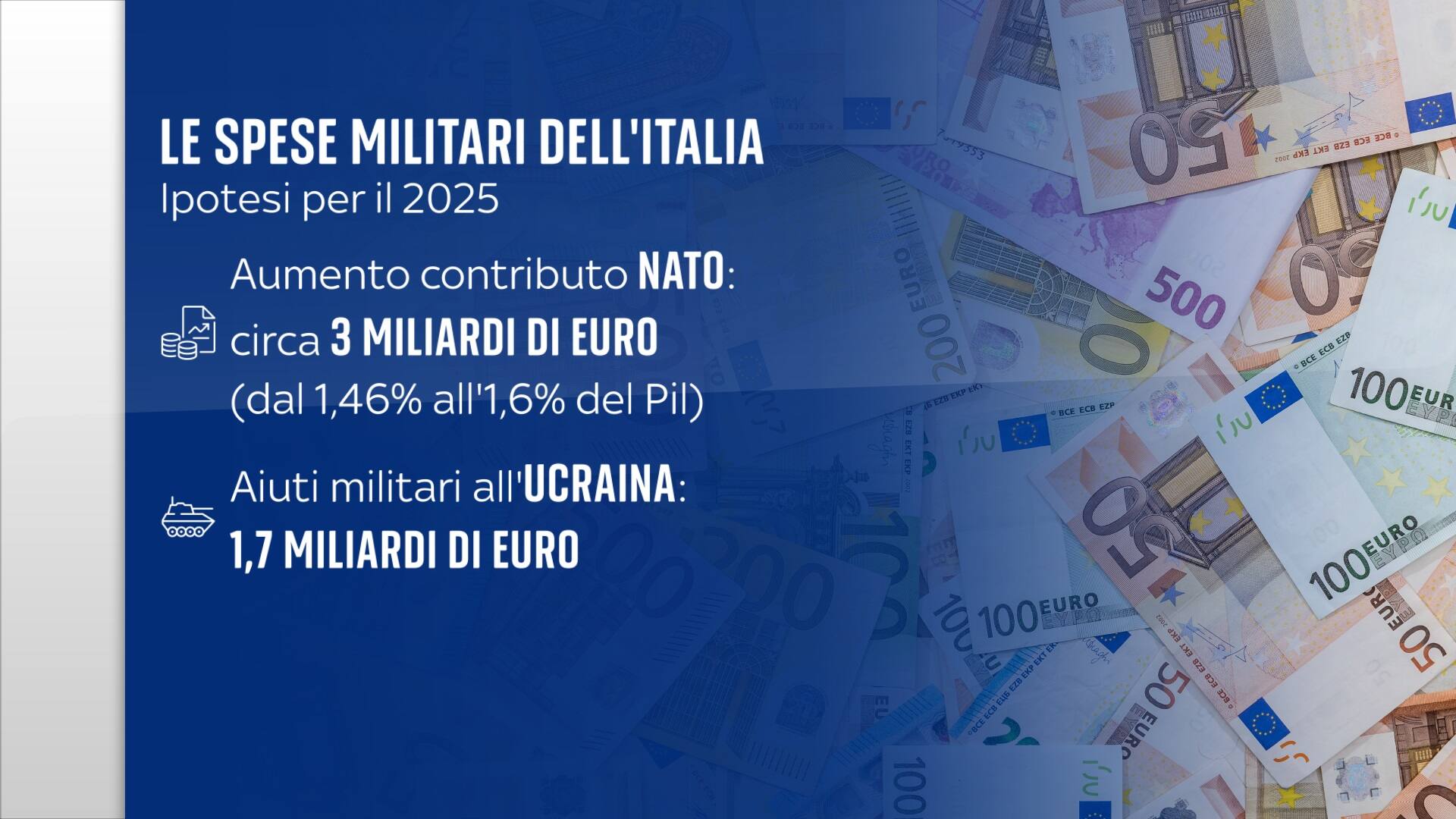 Si arriva a questa cifra perché l’Italia potrebbe alzare la quota di Prodotto Interno Lordo dedicata alla Difesa all’1,6 per cento, avvicinandosi a piccoli passi all'obiettivo del 2 per cento stabilito dall’Alleanza Atlantica e dal quale siamo lontani in compagnia di pochi altri partner. Questo impegno vale circa tre miliardi sull’anno prossimo, al quale aggiungere oltre un miliardo e mezzo per contribuire al nuovo fondo per gli armamenti all’Ucraina.