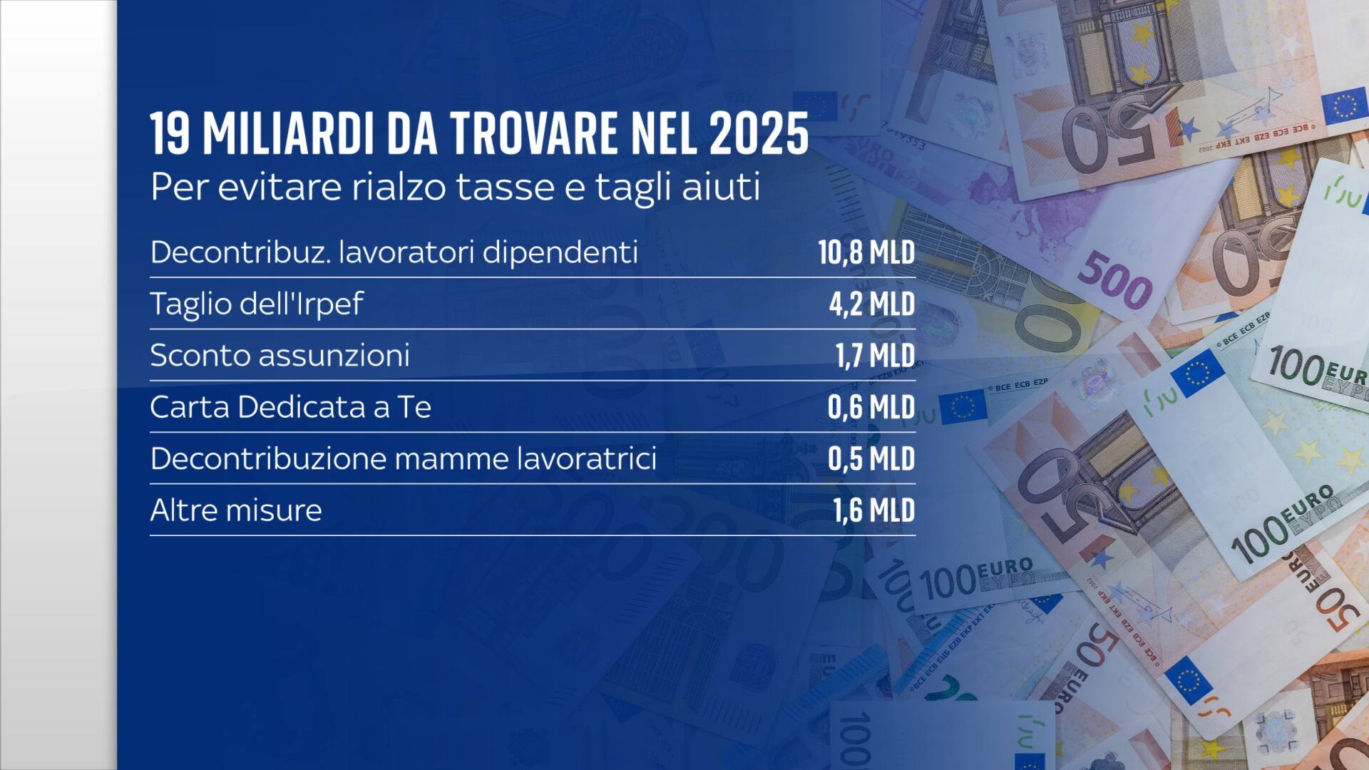 Il tutto in un quadro già complesso, perché servono oltre 19 miliardi se si vogliono rinnovare una serie di aiuti in scadenza molto popolari ed evitare un rialzo delle tasse. In primis, le buste paga dei dipendenti: Palazzo Chigi ha assicurato che ci sono i quasi 11 miliardi per rinnovare il taglio del cosiddetto cuneo fiscale evitando un calo degli stipendi a 14 milioni di lavoratori. Ma nella lista c’è anche la proroga della riduzione dell’Irpef (l’imposta sui redditi), degli sconti per le assunzioni, quello per le mamme lavoratrici con due figli, il contributo per la spesa delle famiglie in difficoltà e la riduzione del canone Rai.