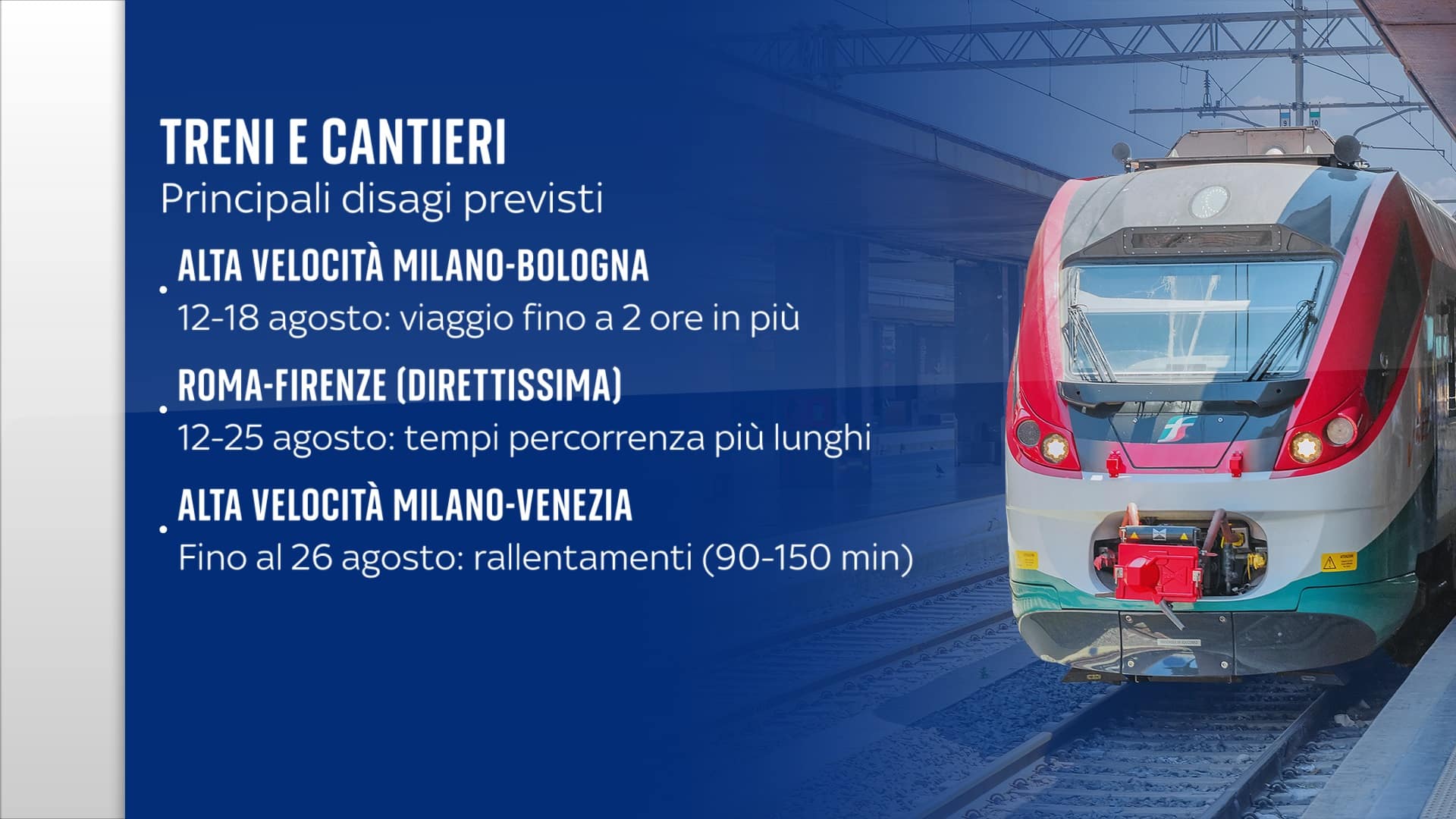 L’agosto sui binari potrà rivelarsi al rallentatore per molti passeggeri in partenza e rientro dalle vacanze e per chi va in treno al lavoro. Fino a due ore in più per Milano-Bologna con il Frecciarossa, fino a due ore e mezza dal capoluogo lombardo a Venezia e tempi più lunghi anche per il Roma-Firenze. Il motivo? Lavori ordinari e straordinari sulle linee ferroviarie, in parte per ammodernare la rete coi fondi del Pnrr.