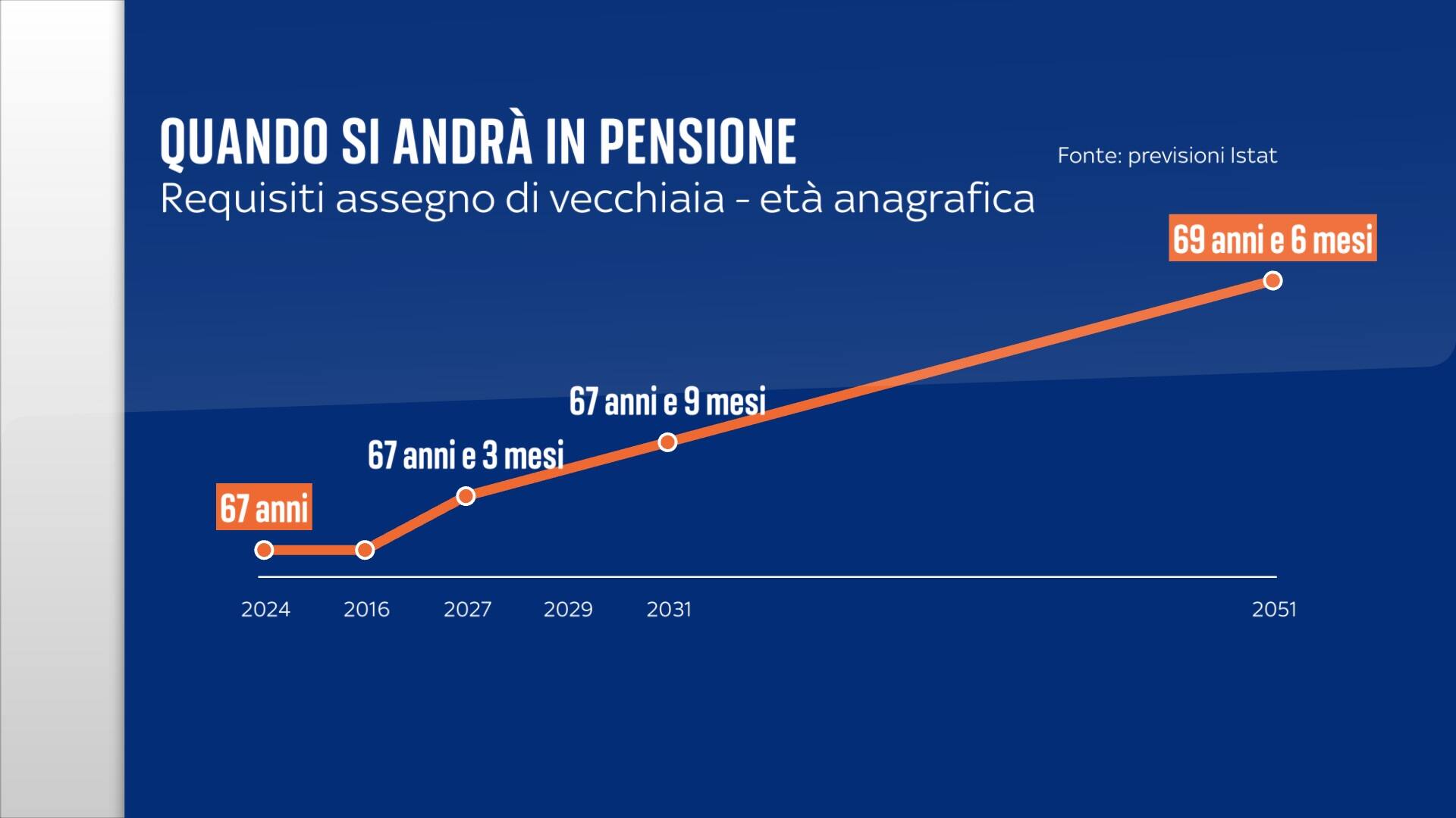 Questa soglia è, comunque, destinata ad allungarsi, perché la legge prevede che si esca dal lavoro sempre più tardi man mano che aumenta la speranza di vita. Si tratta, in pratica, di un automatismo: se l’aspettativa di campare oltre i 65, statisticamente, aumenta, ogni due anni per lasciare il posto serviranno tre mesi in più. Così, dal 2027 bisognerà avere 67 anni e tre mesi, quasi 68 dal 2031 e 70 anni dal 2055.