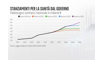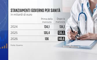 - Secondo le stime del governo, dagli attuali 134,1 miliardi gli stanziamenti per la sanità saliranno il prossimo anno a 136,5, circa 2 miliardi e mezzo in più. Mentre nel 2026 toccheranno quota 140,6 miliardi