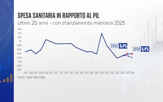 - Come evidenzia il Documento programmatico di bilancio, negli ultimi 20 anni la spesa sanitaria in rapporto al Pil è calata, ad eccezione del periodo segnato dall’emergenza pandemica da Covid 19. Nel 2025-26 la spesa andrà verso una stabilizzazione con una incidenza pari al 6,4% del Pil, tra i livelli più bassi negli ultimi vent'anni
