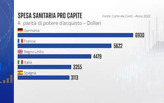 - Come calcola la Corte dei Conti, nel 2022 la spesa sanitaria pro capite, a parità di potere d’acquisto, ammontava a 3.255 dollari. Rispetto alle principali economie europee, l'Italia ha fatto meglio solo della Spagna (3.113 miliardi) e rimane dietro a paesi come Regno Unito, Francia e Germania dove la spesa sanitaria pro capite tocca i 6.930 dollari