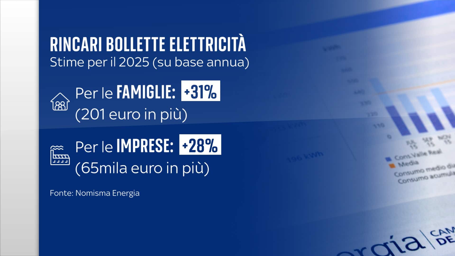 Pur essendo lontano dai picchi del 2022, il costo del gas all’ingrosso negli ultimi tempi è aumentato, tanto che si stimano pesanti incrementi di spesa. Per l’elettricità (che in Italia è la più cara d’Europa), Nomisma si aspetta un rialzo del 31 per cento annuo nel 2025 per le famiglie e del 28 per cento per le aziende.