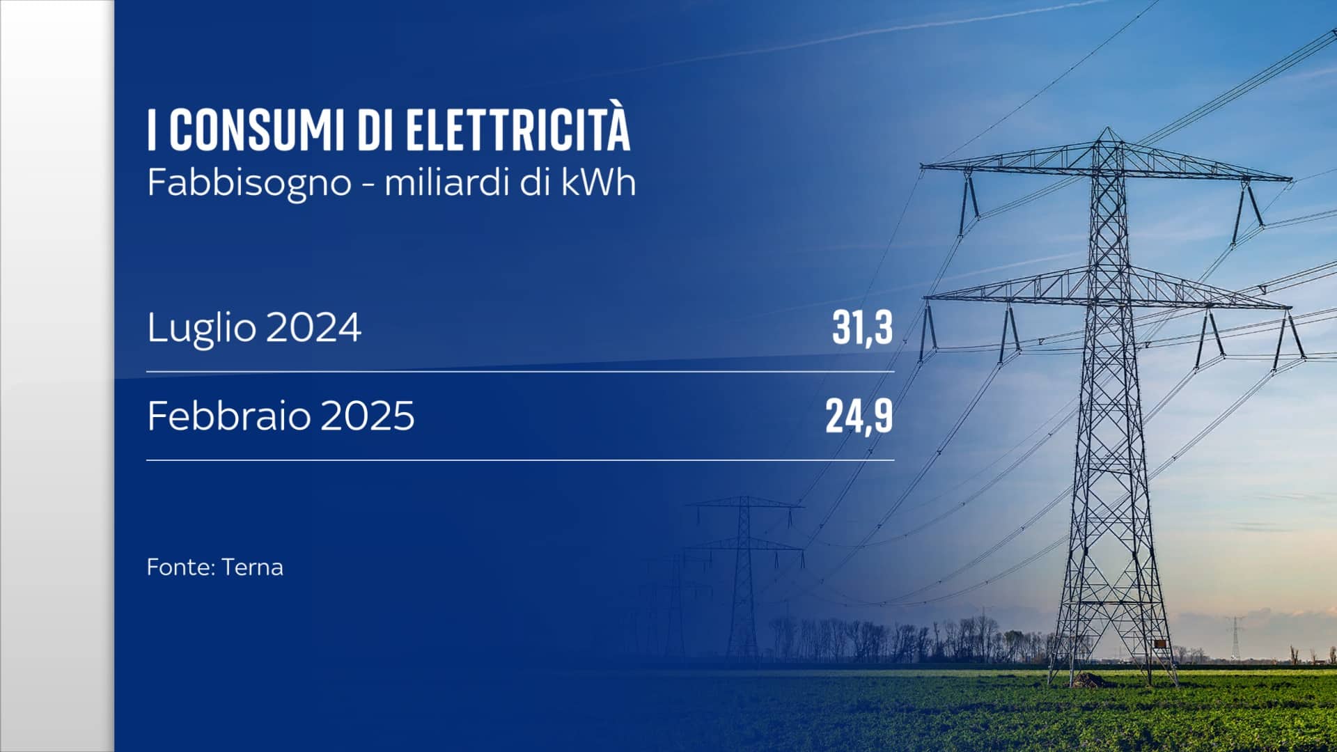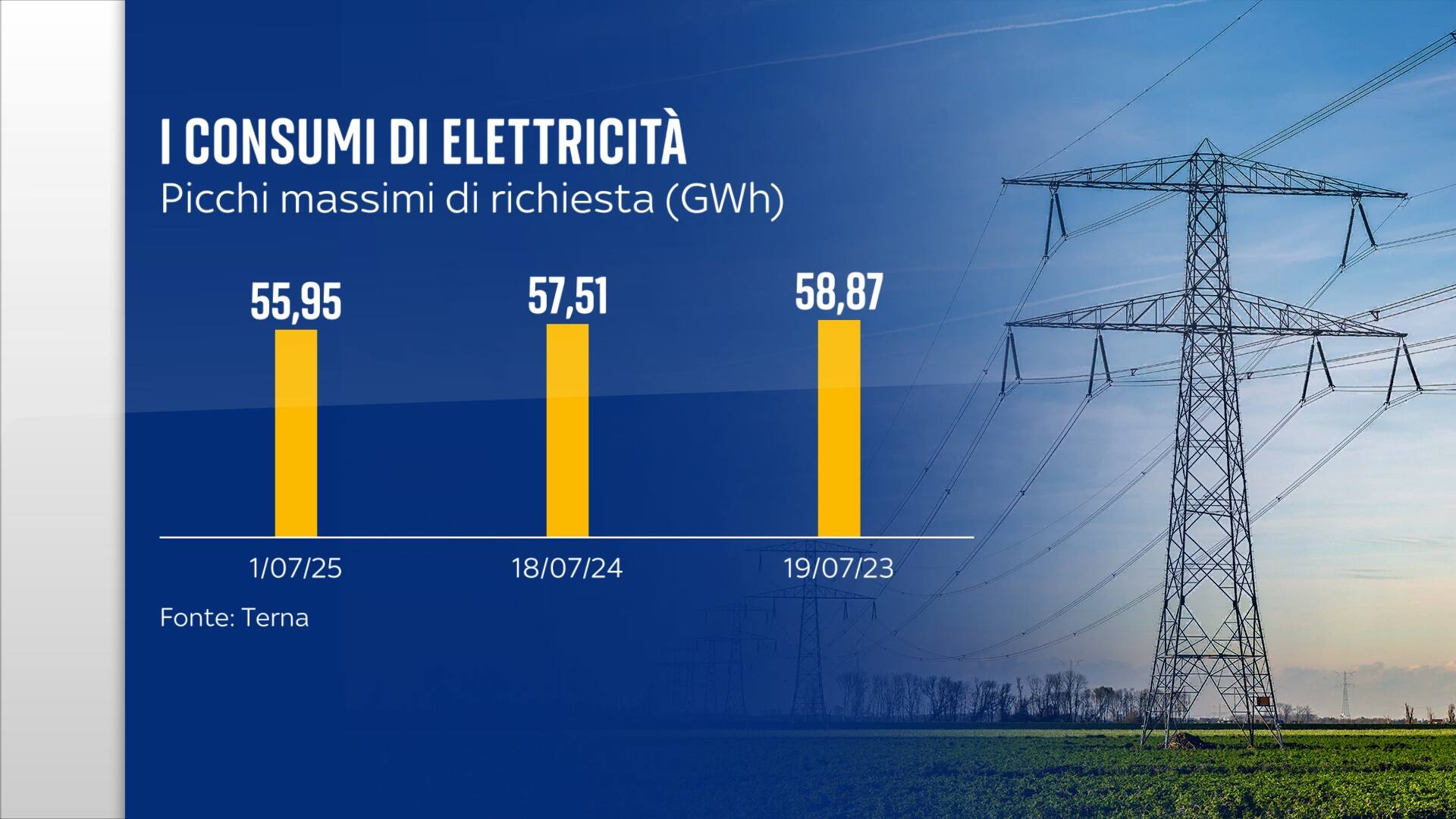 Negli ultimi giorni i consumi si sono avvicinati ai massimi storici. Il picco registrato il 1° luglio ha sfiorato i 56 gigawatt l’ora, a un passo dalla vetta raggiunta nel luglio dell’anno scorso (57,51) e non molto distante da quella ancora più alta di due anni fa (58,87). Si tratta di livelli che non si toccano mai durante il resto dell’anno. Per farsi un’idea basti pensare che quanto richiesto nel luglio del 2024 è stato di circa il 25 per cento superiore all’elettricità utilizzata nel febbraio 2025.