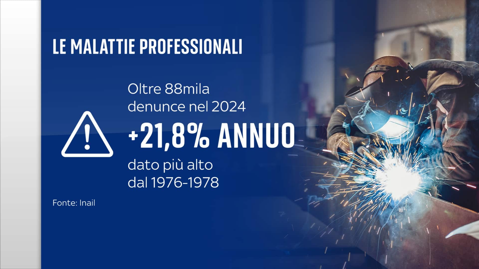 Ricordando che si tratta sempre di denunce, quindi da verificare caso per caso, dalla Relazione annuale dell'Inail emerge il forte rialzo delle malattie professionali: oltre 88mila, mai così tante da quasi cinquant’anni, per effetto anche dell’ampliamento delle patologie considerate.