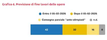 Il report indica poi che "si evince un ulteriore dato sulle tempistiche di consegna delle opere, per cui per 16 opere tra le 48 in consegna dopo febbraio 2026 viene indicata una 'fine ante-olimpiadi'. In assenza di metadati (ossia un’indicazione da chi rilascia il dato di come intendere questa locuzione)", si suppone che il dato "intenda una scadenza per una consegna parziale dell'opera in tempo per lo svolgimento dei Giochi, che poi si concluderà in seguito". Tra queste 16 opere "ci sono anche otto opere essenziali per lo svolgimento dell'evento olimpico (quindi non di legacy), per esempio: