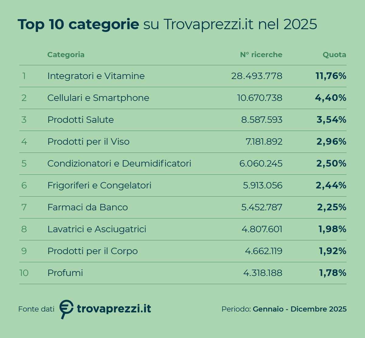 EconomiaÈquanto emerge dall'analisi di oltre 242 milioni di ricerche complessive effettuate sul proprio portale, nel corso del 2025, da Trovaprezzi.it, società italiana leader nel mercato della comparazione prezzi degli operatori di e-commerce