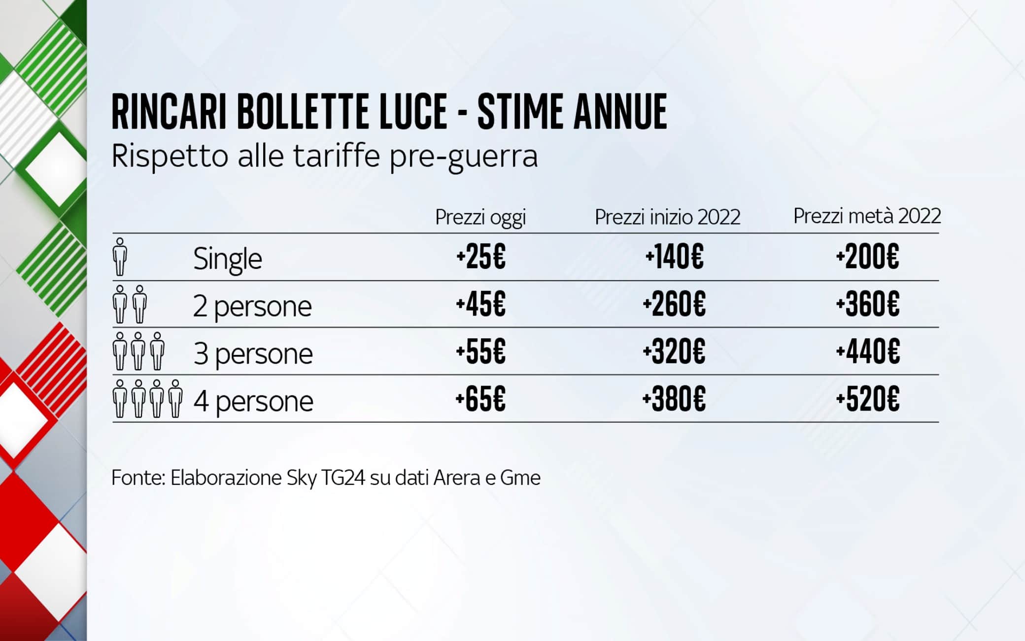 Fanno ancora discutere i possibili aumenti delle bollette di luce e gas a seguito della guerra in Iran. Secondo le nuove proiezioni realizzate da Facile.it, al 17 marzo il prezzo per la bolletta annuale del gas per una famiglia media ha raggiunto 1.929 euro e quella per la luce 913 euro, con un aumento complessivo rispetto a prima della guerra in Iran di 416 euro. Aumenti destinati a ricadere anche sulle attività: Confesercenti ha infatti stimato un aumento di 900 milioni delle bollette per gli esercizi commerciali e turistici. I rincari dei prezzi di luce e gas sono stati al centro della puntata del 17 marzo di Numeri, approfondimento di Sky TG24.